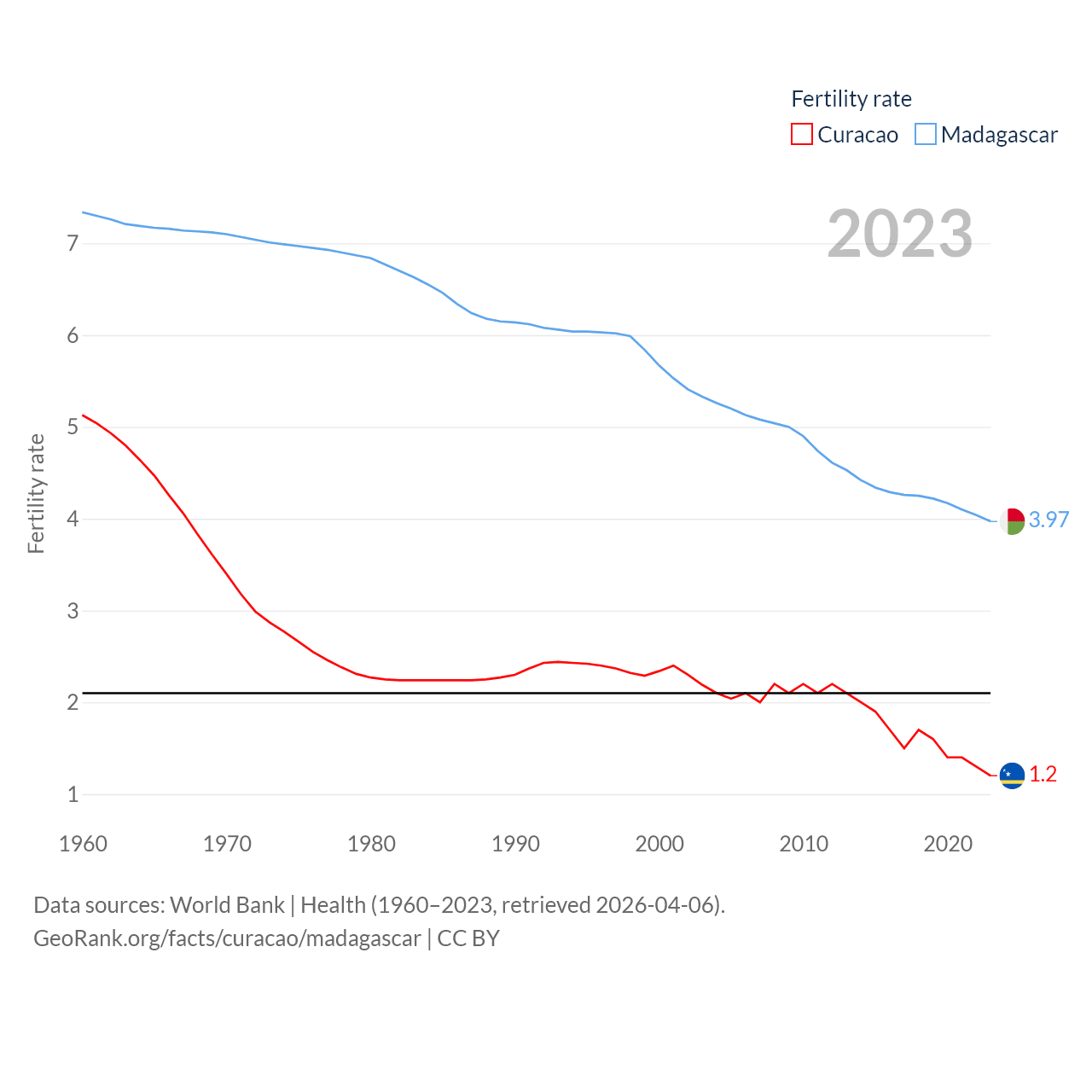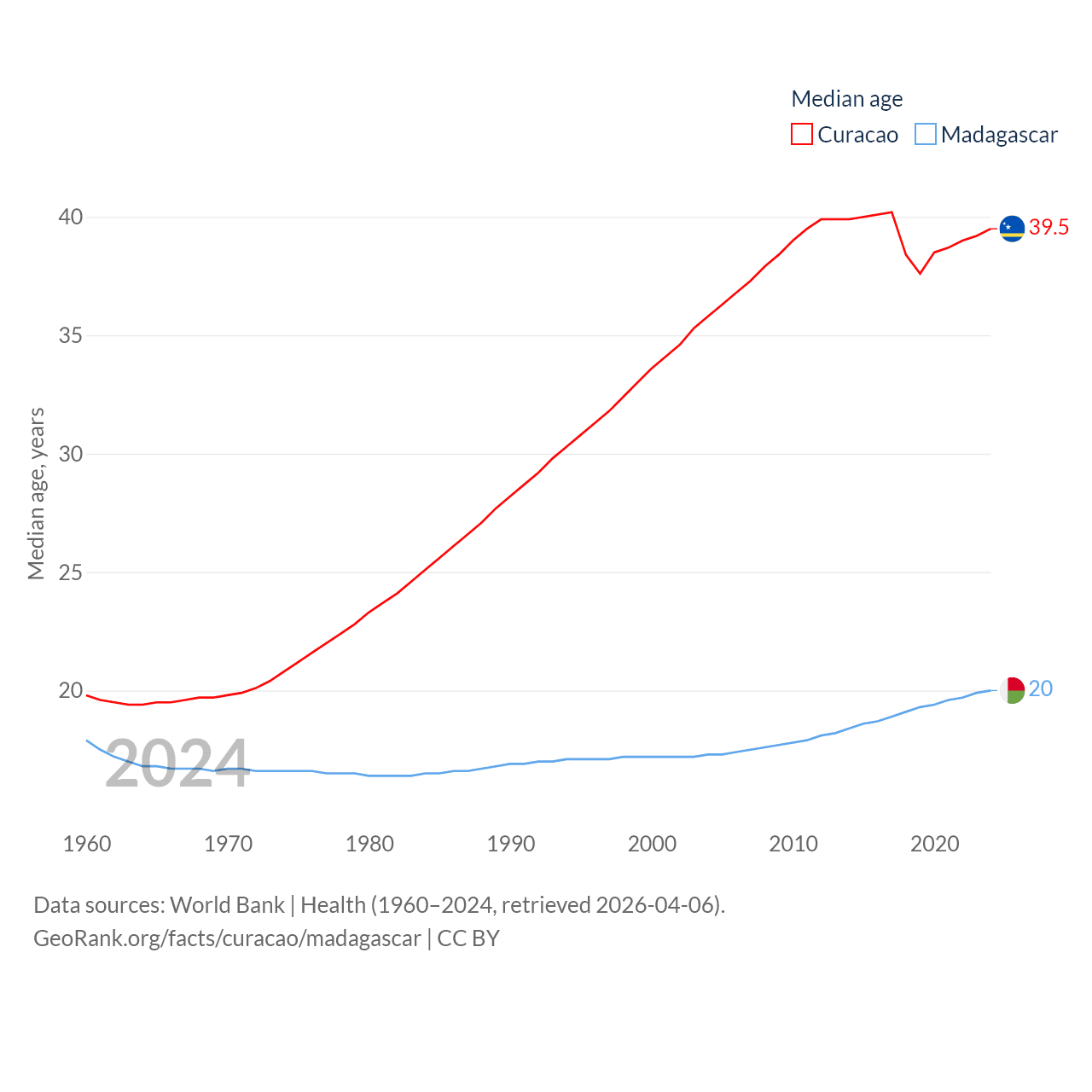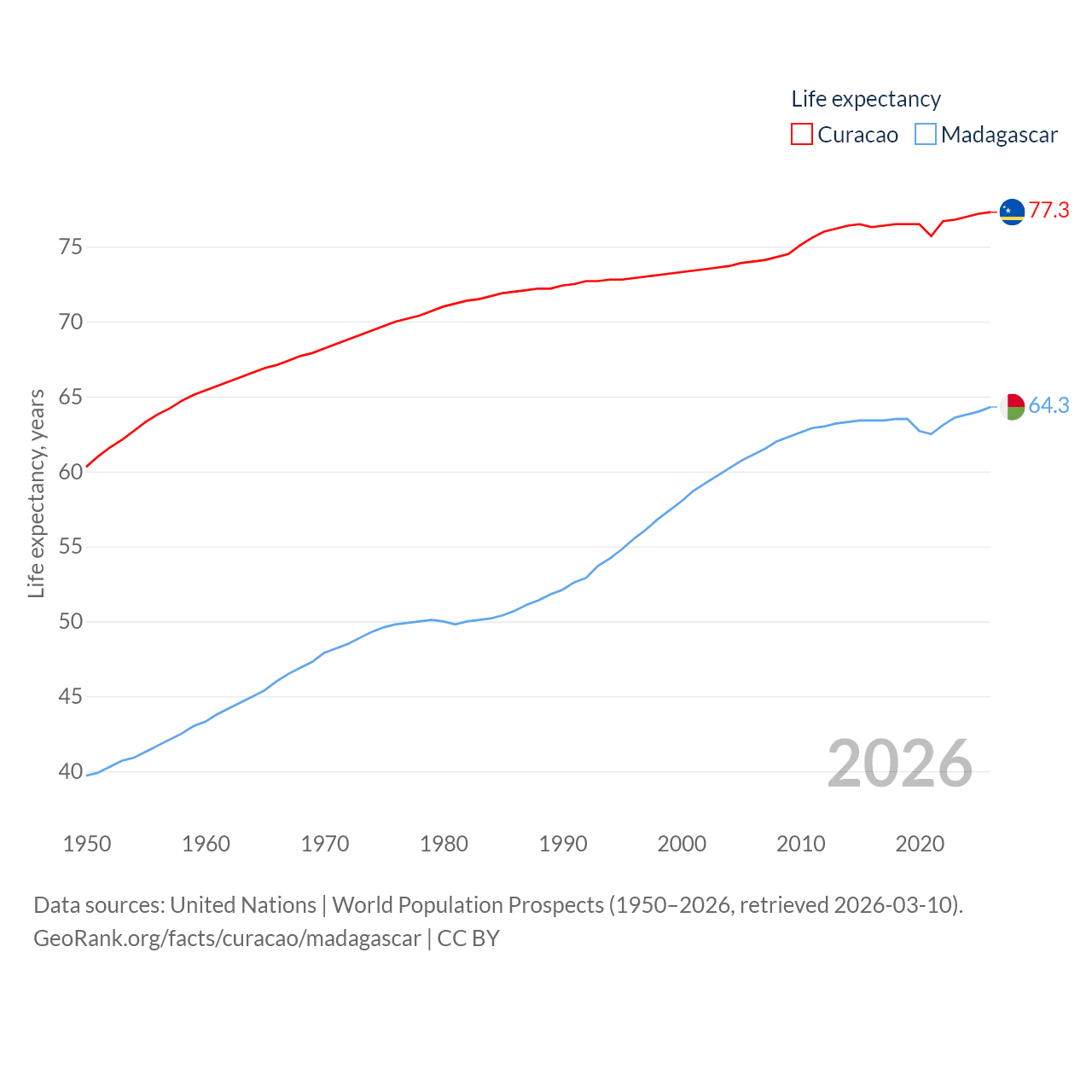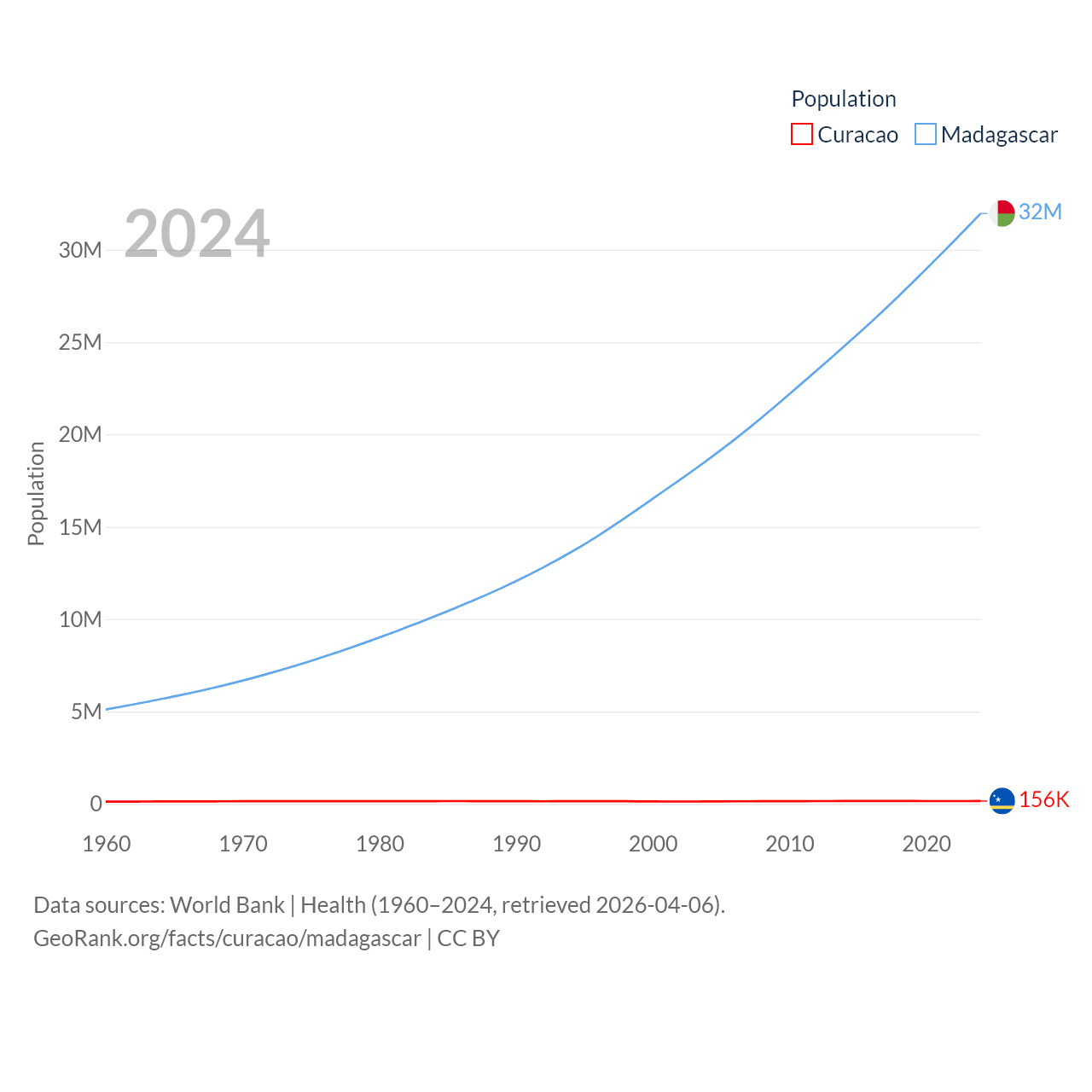 Curacao has a population of 156K (ranked 179/197), compared with 32M in Madagascar (ranked 49/197). Curacao's land area is 171.4 sq mi versus 224,634 sq mi for Madagascar (ranked 182nd vs. 44th).