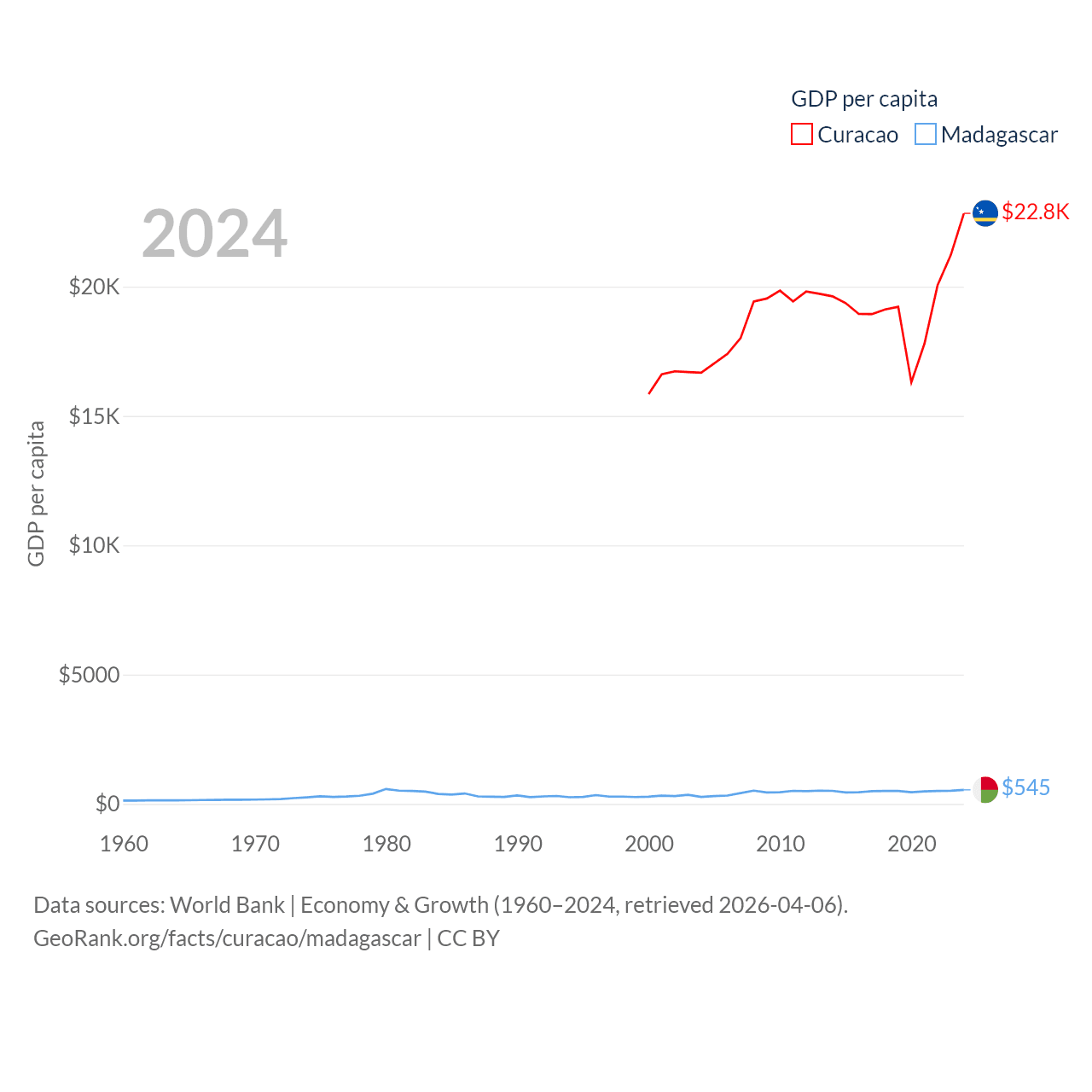 By GDP, Curacao ranks 167/197 ($3.56B) and Madagascar ranks 136/197 ($17.4B). By GDP per capita, Curacao ranks 56/197 ($22,833), while Madagascar ranks 193/197 ($545).