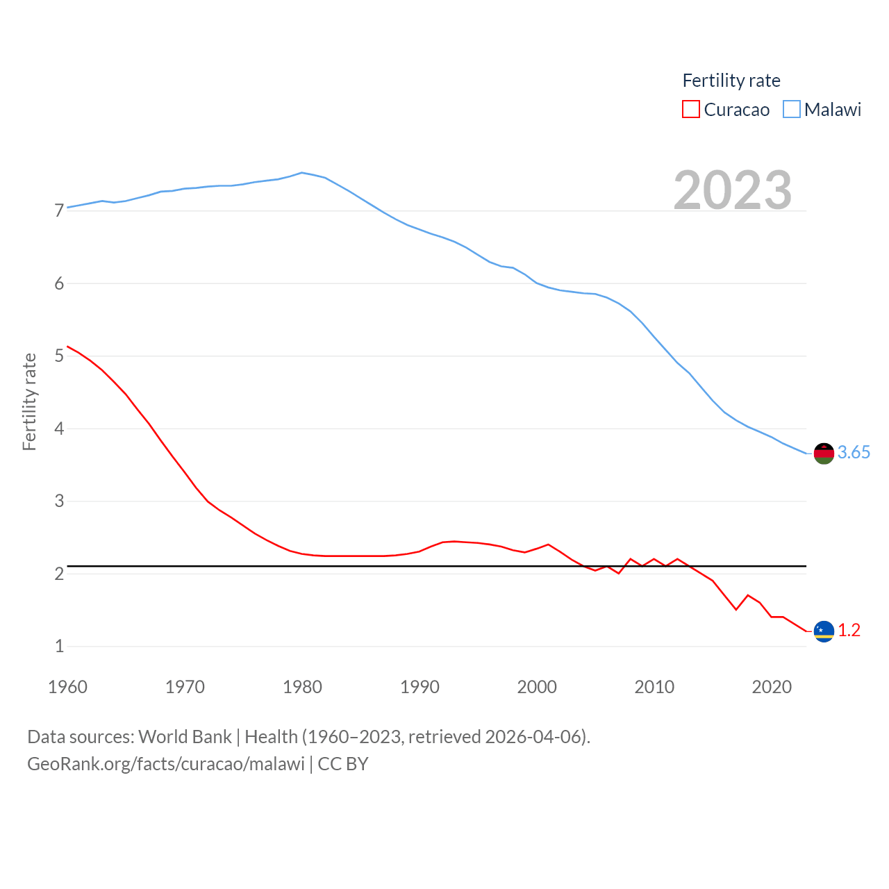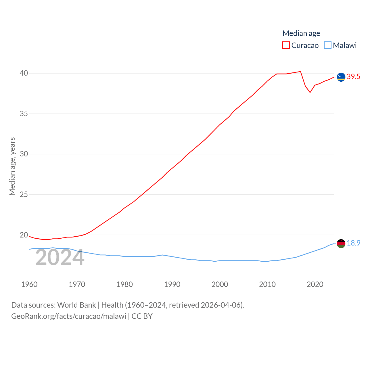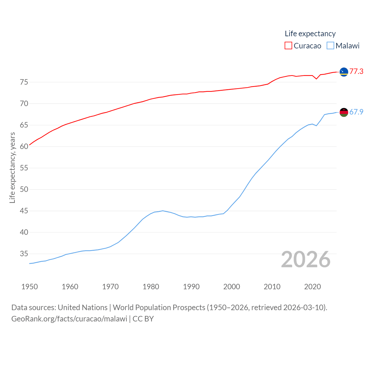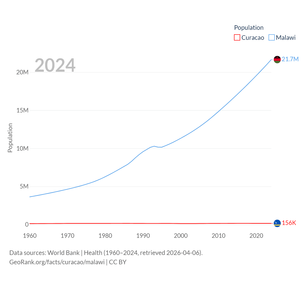 Curacao has a population of 156K (ranked 179/197), compared with 21.7M in Malawi (ranked 62/197). Curacao's land area is 171.4 sq mi versus 36,402 sq mi for Malawi (ranked 182nd vs. 107th).