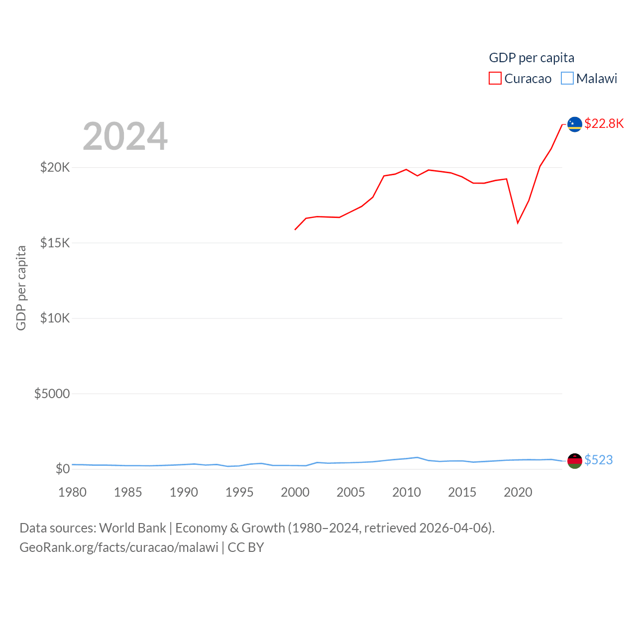 By GDP, Curacao ranks 167/197 ($3.56B) and Malawi ranks 151/197 ($11.3B). By GDP per capita, Curacao ranks 56/197 ($22,833), while Malawi ranks 194/197 ($523).