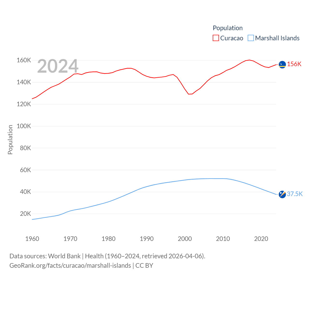 Curacao has a population of 156K (ranked 179/197), compared with 37.5K in The Marshall Islands (ranked 192/197). Curacao's land area is 171.4 sq mi versus 69.5 sq mi for The Marshall Islands (ranked 182nd vs. 191st).