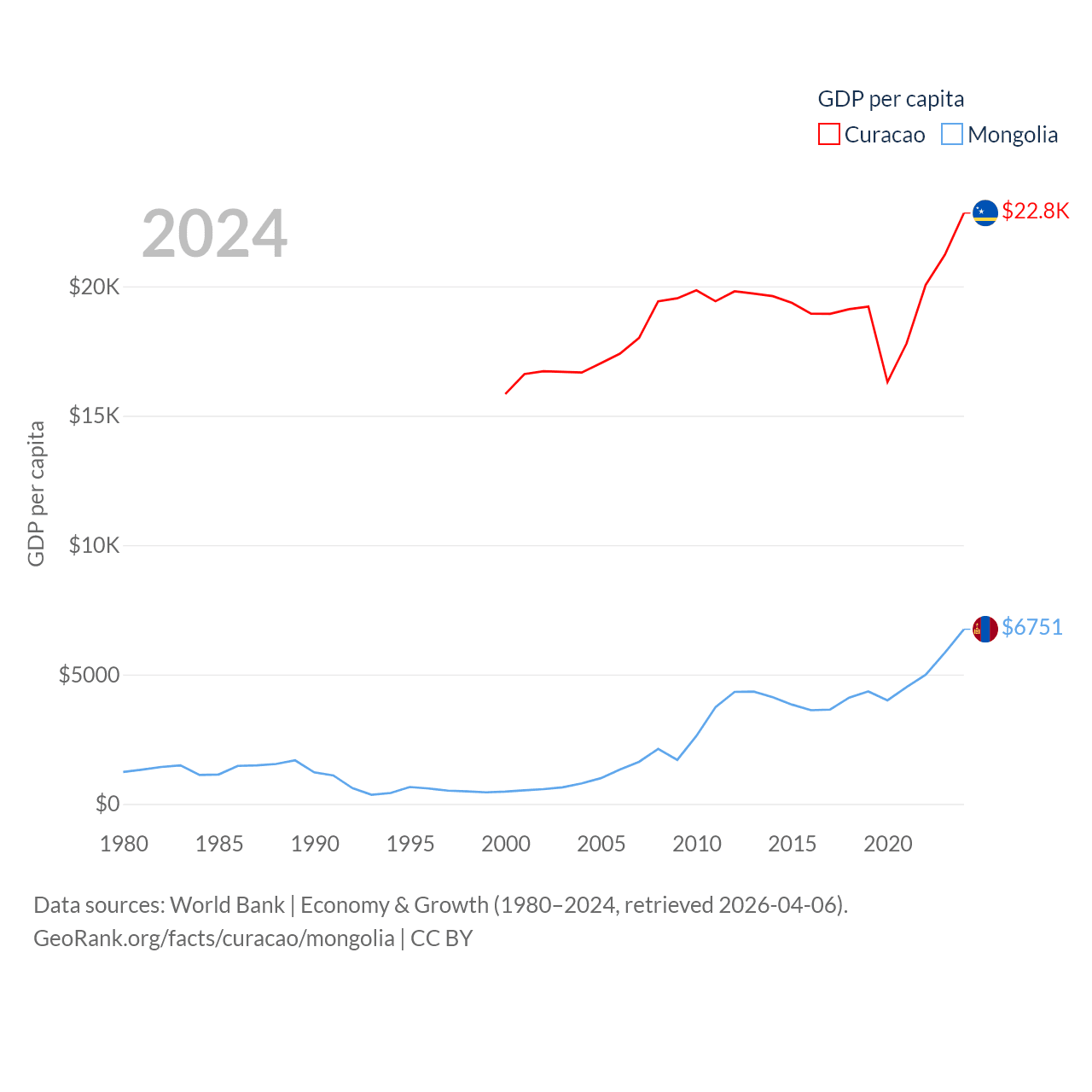 By GDP, Curacao ranks 167/197 ($3.56B) and Mongolia ranks 121/197 ($23.8B). By GDP per capita, Curacao ranks 56/197 ($22,833), while Mongolia ranks 105/197 ($6,751).