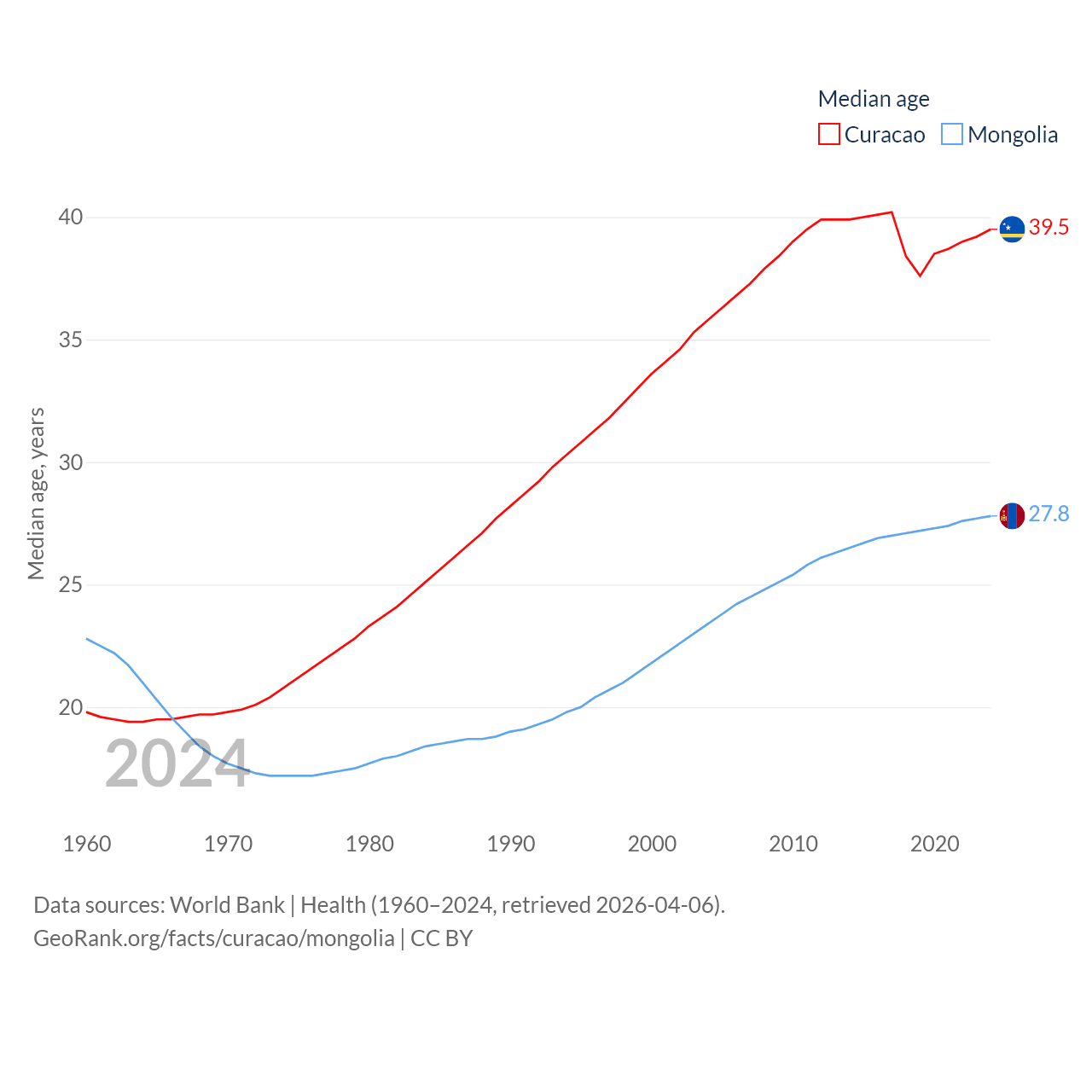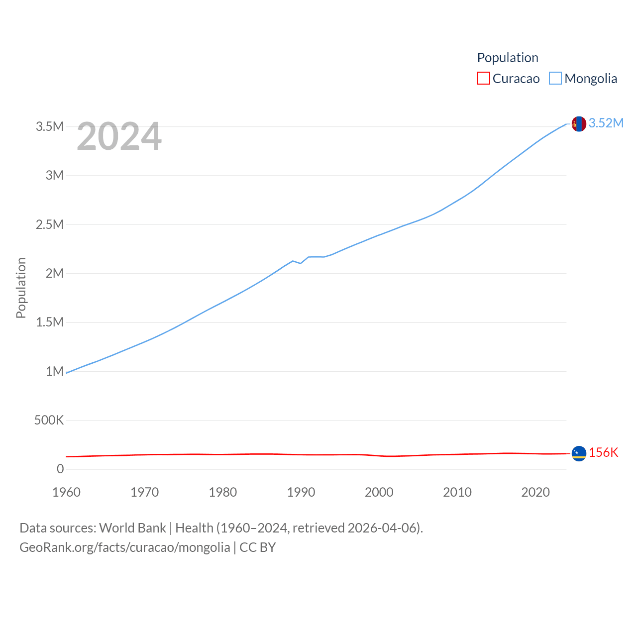 Curacao has a population of 156K (ranked 179/197), compared with 3.52M in Mongolia (ranked 132/197). Curacao's land area is 171.4 sq mi versus 601,740 sq mi for Mongolia (ranked 182nd vs. 18th).