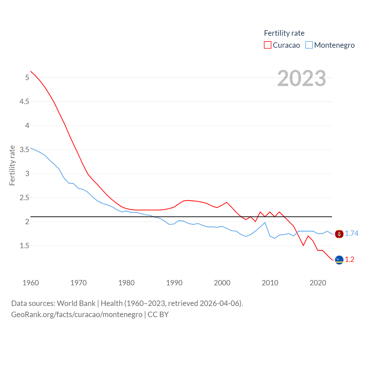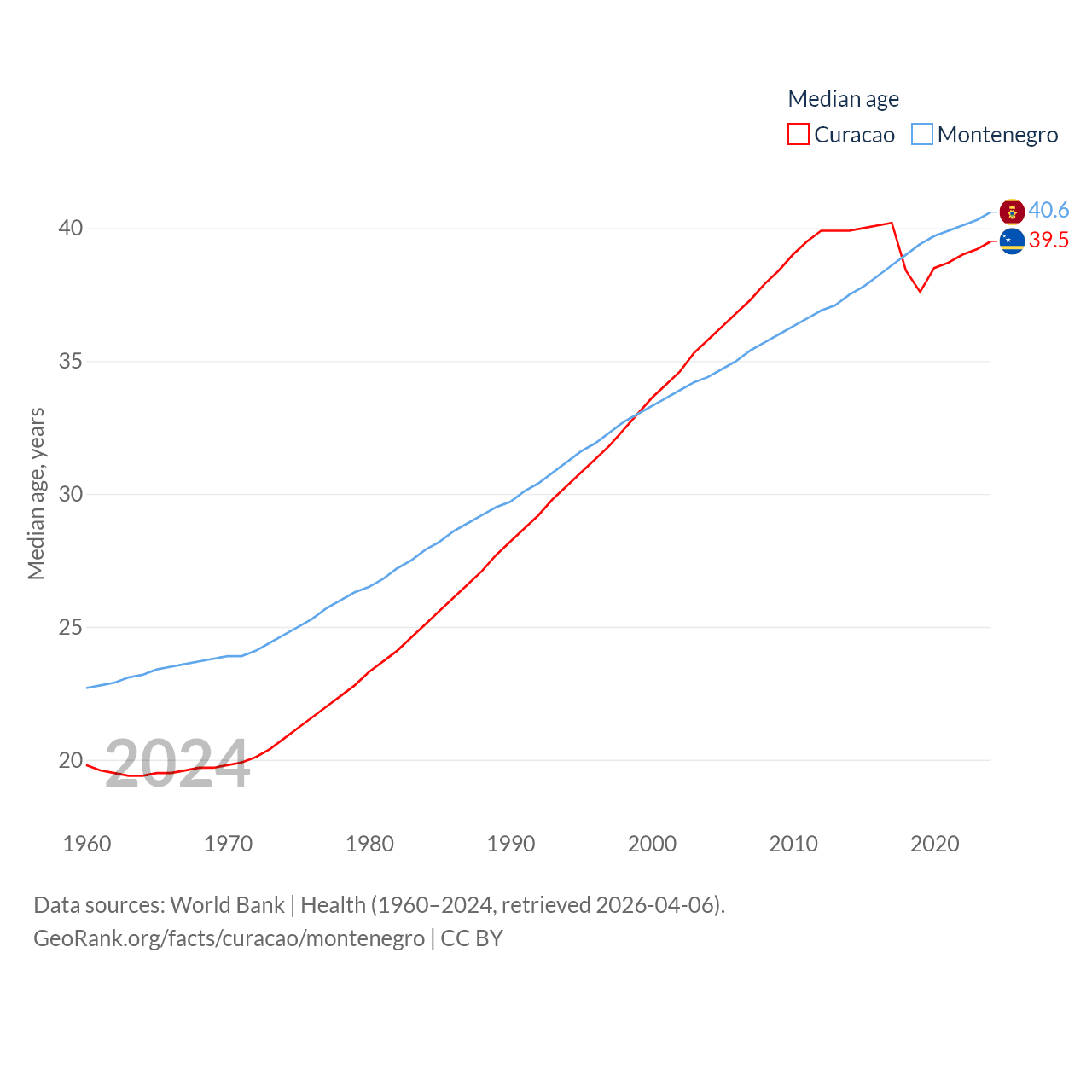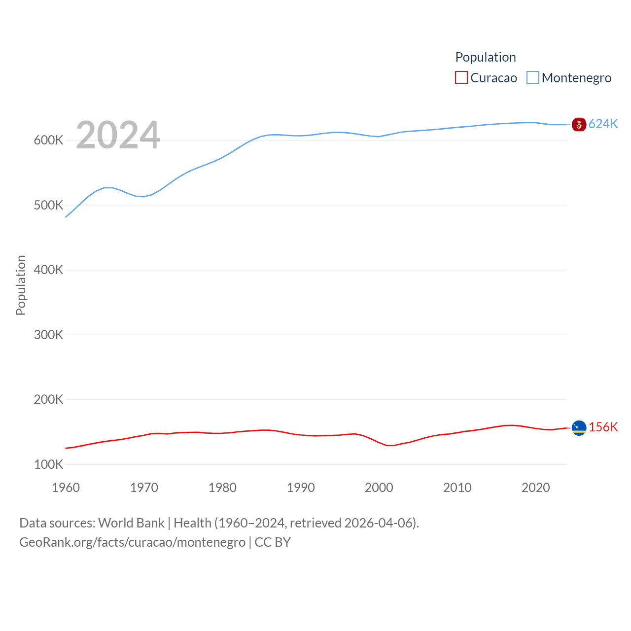 Curacao has a population of 156K (ranked 179/197), compared with 624K in Montenegro (ranked 166/197). Curacao's land area is 171.4 sq mi versus 5,193 sq mi for Montenegro (ranked 182nd vs. 156th).
