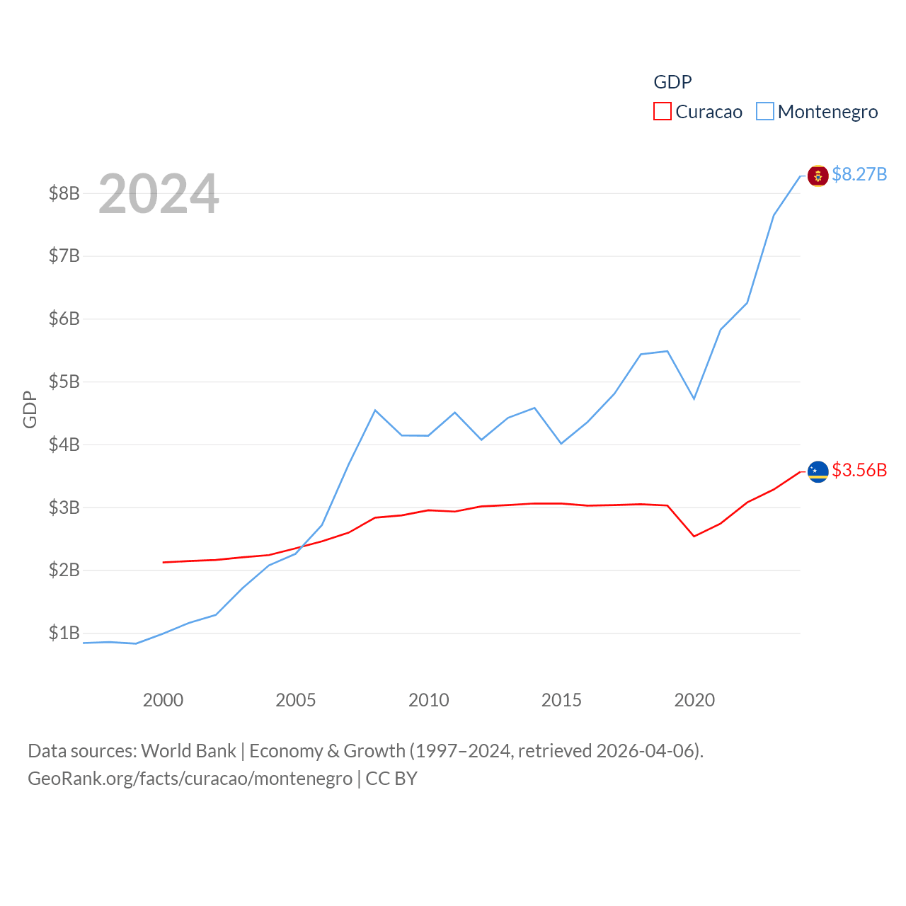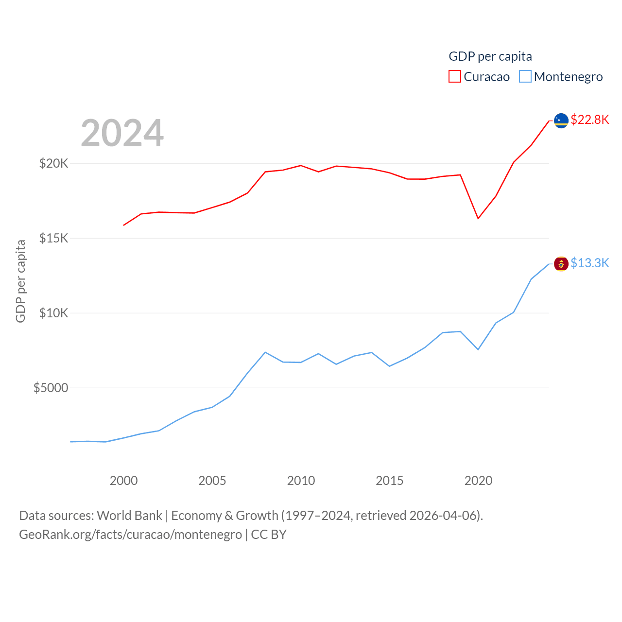 By GDP, Curacao ranks 167/197 ($3.56B) and Montenegro ranks 155/197 ($8.27B). By GDP per capita, Curacao ranks 56/197 ($22,833), while Montenegro ranks 77/197 ($13,263).