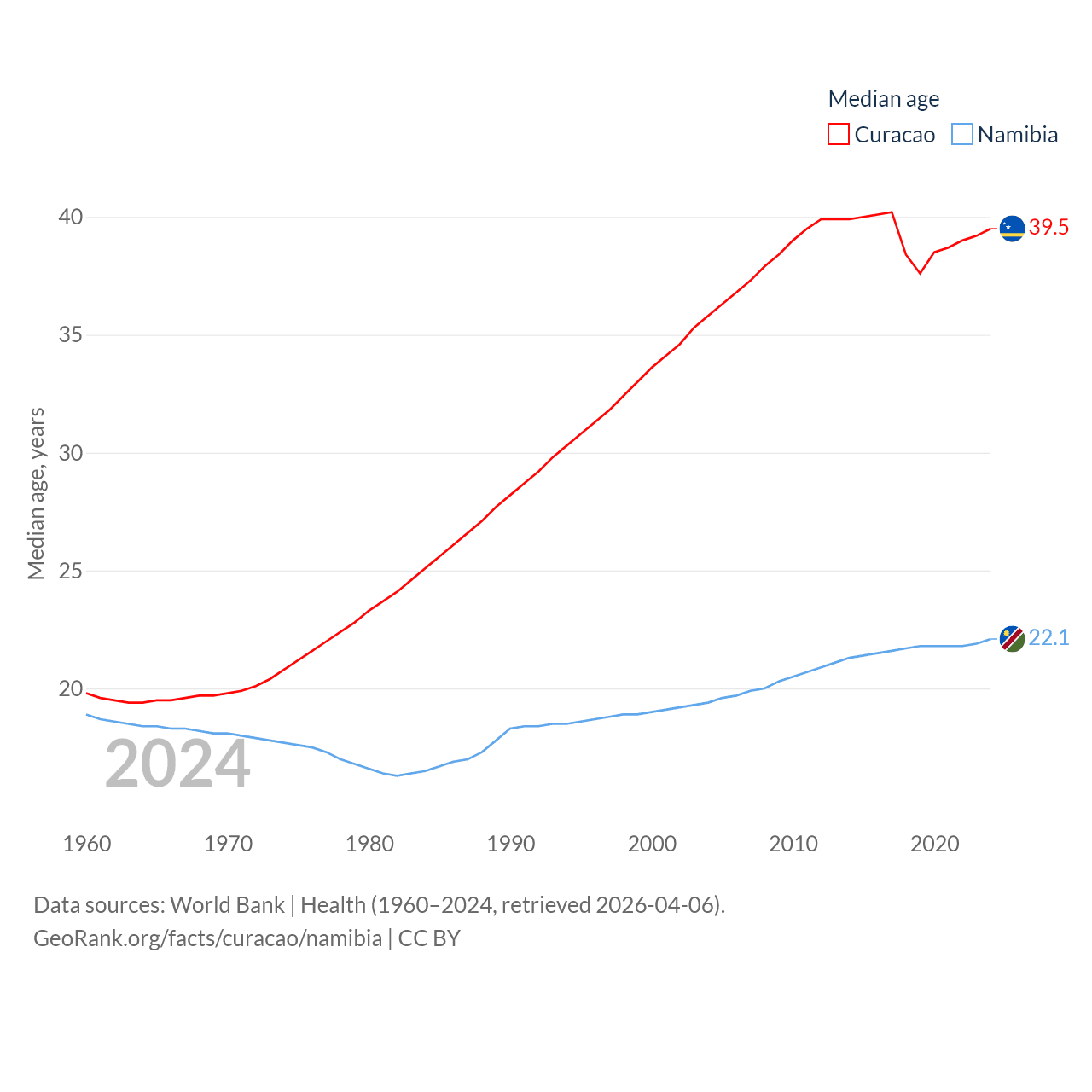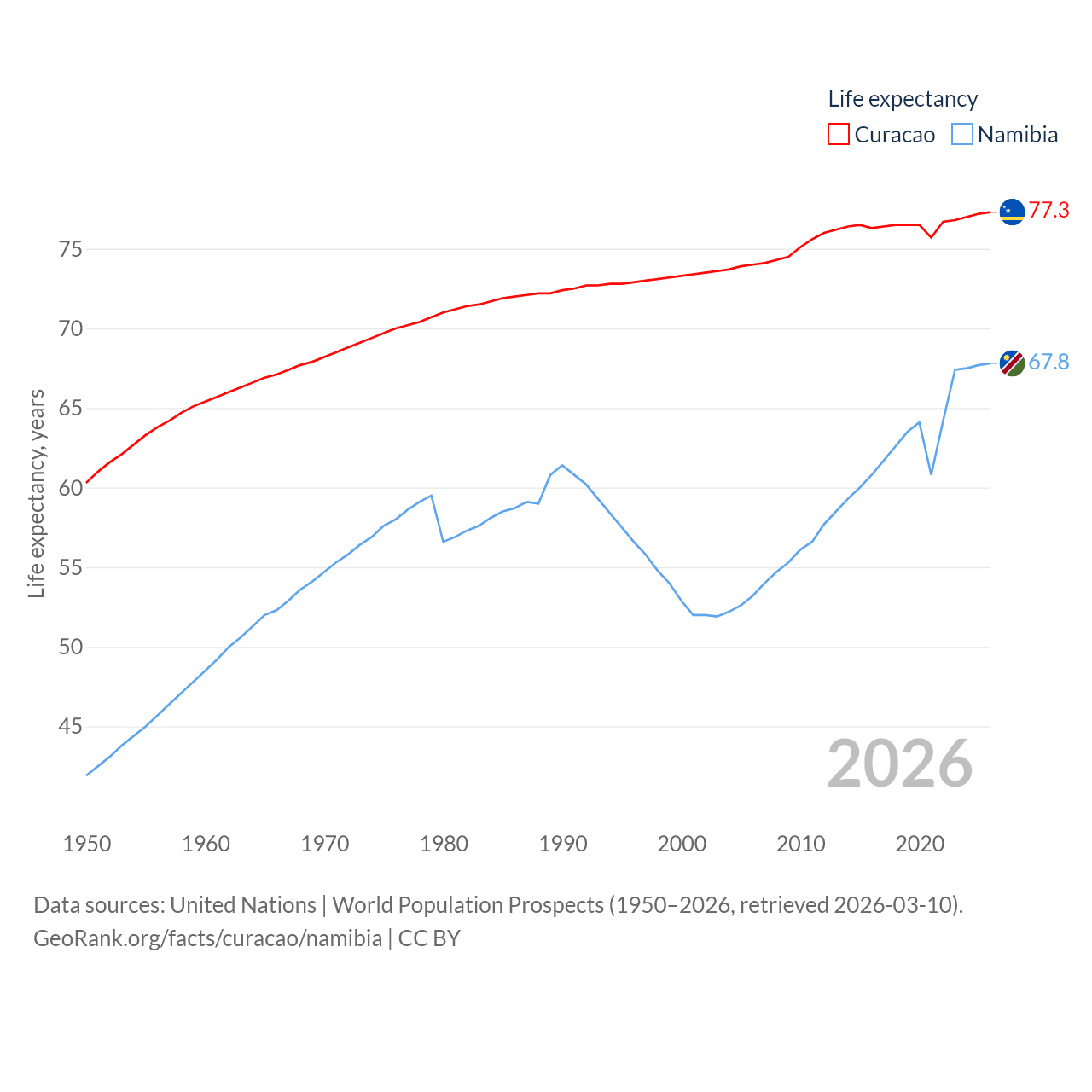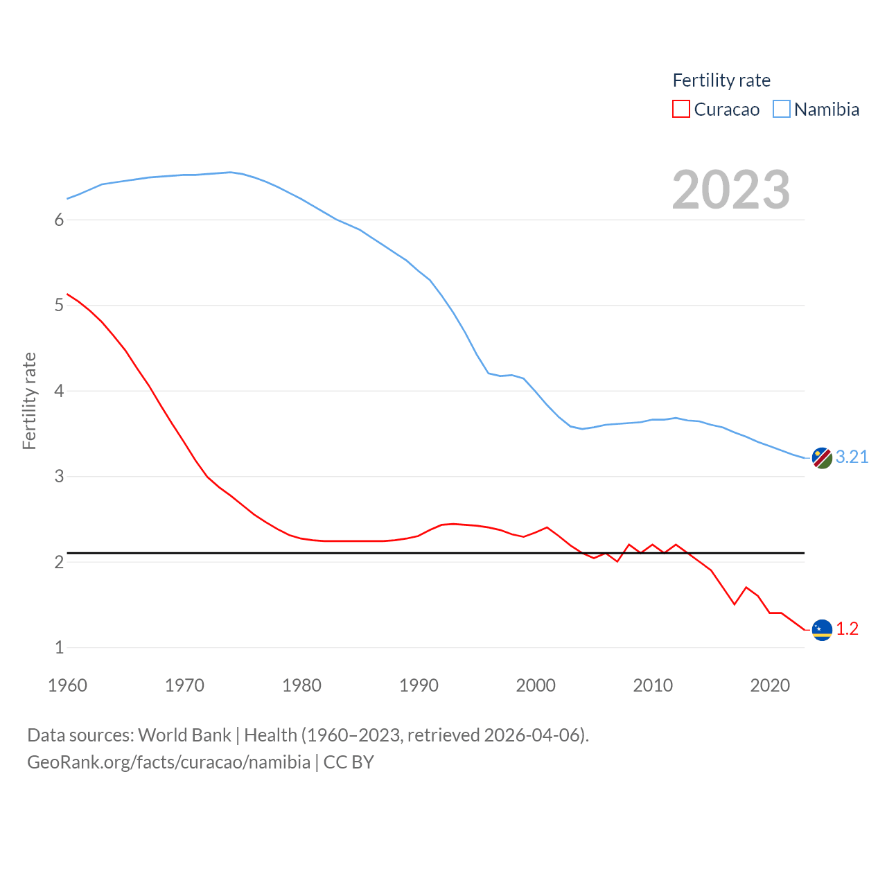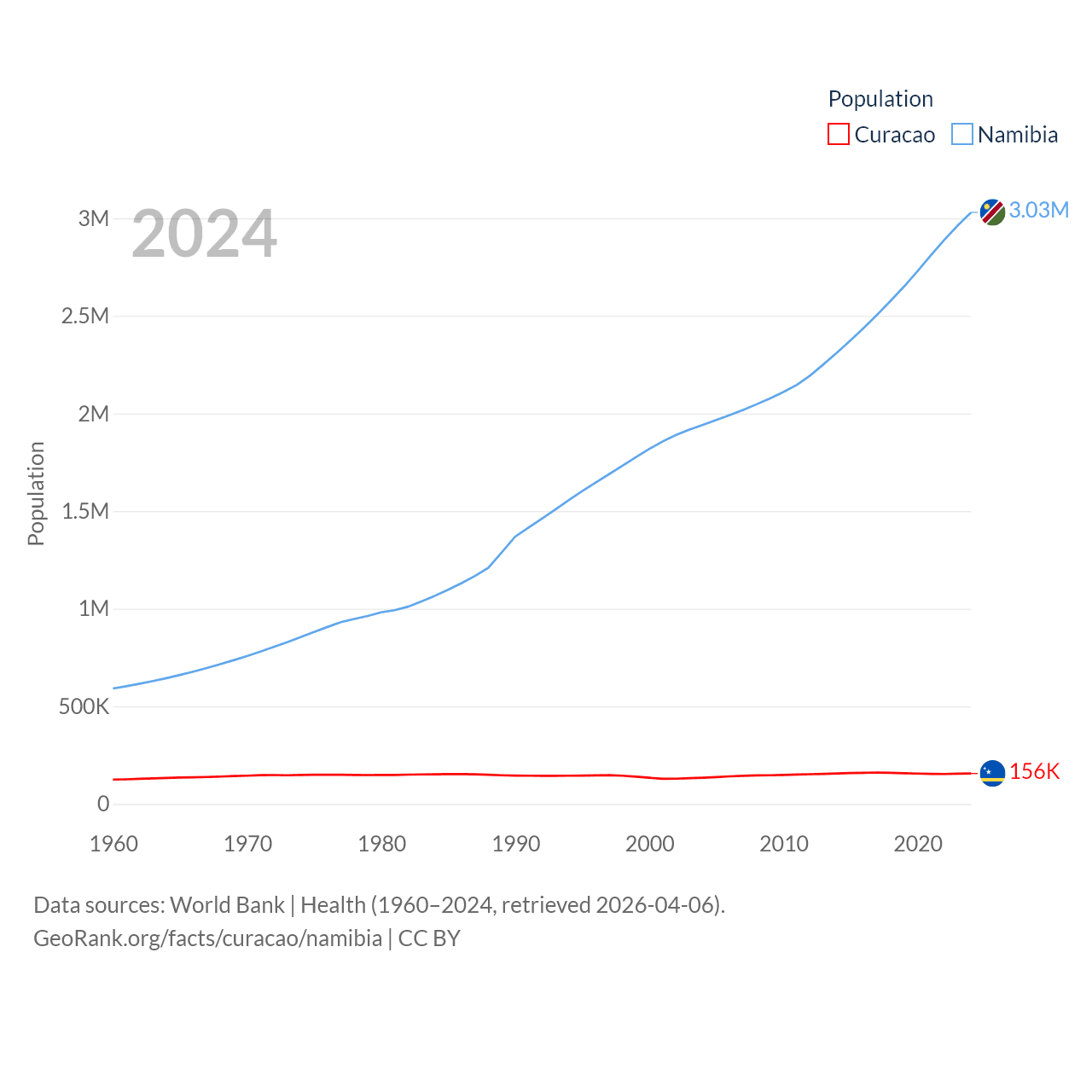 Curacao has a population of 156K (ranked 179/197), compared with 3.03M in Namibia (ranked 136/197). Curacao's land area is 171.4 sq mi versus 317,874 sq mi for Namibia (ranked 182nd vs. 33rd).
