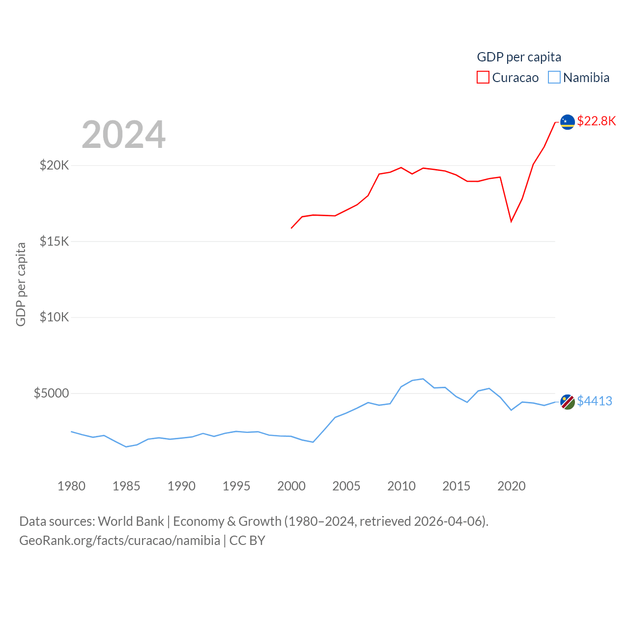By GDP, Curacao ranks 167/197 ($3.56B) and Namibia ranks 147/197 ($13.4B). By GDP per capita, Curacao ranks 56/197 ($22,833), while Namibia ranks 126/197 ($4,413).