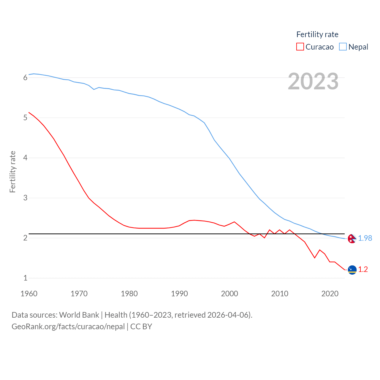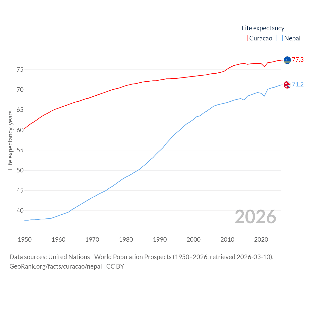 Curacao has a population of 156K (ranked 179/197), compared with 29.7M in Nepal (ranked 51/197). Curacao's land area is 171.4 sq mi versus 55,348 sq mi for Nepal (ranked 182nd vs. 92nd).