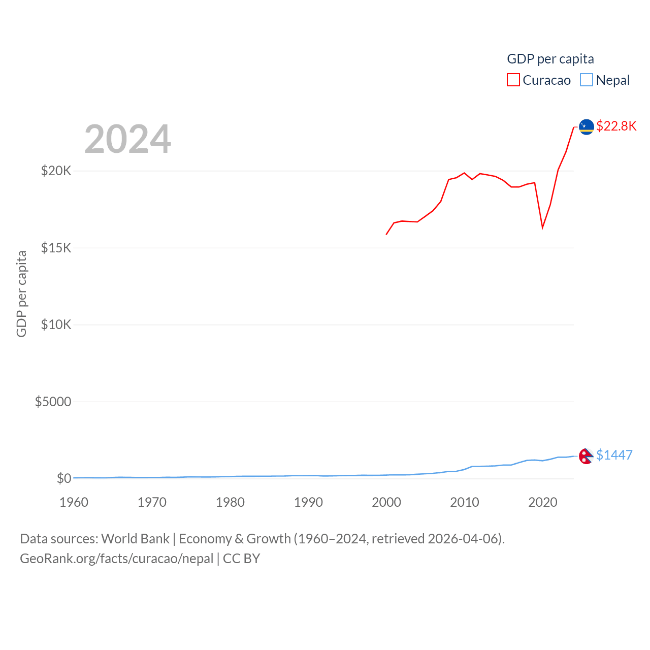 By GDP, Curacao ranks 167/197 ($3.56B) and Nepal ranks 101/197 ($42.9B). By GDP per capita, Curacao ranks 56/197 ($22,833), while Nepal ranks 164/197 ($1,447).