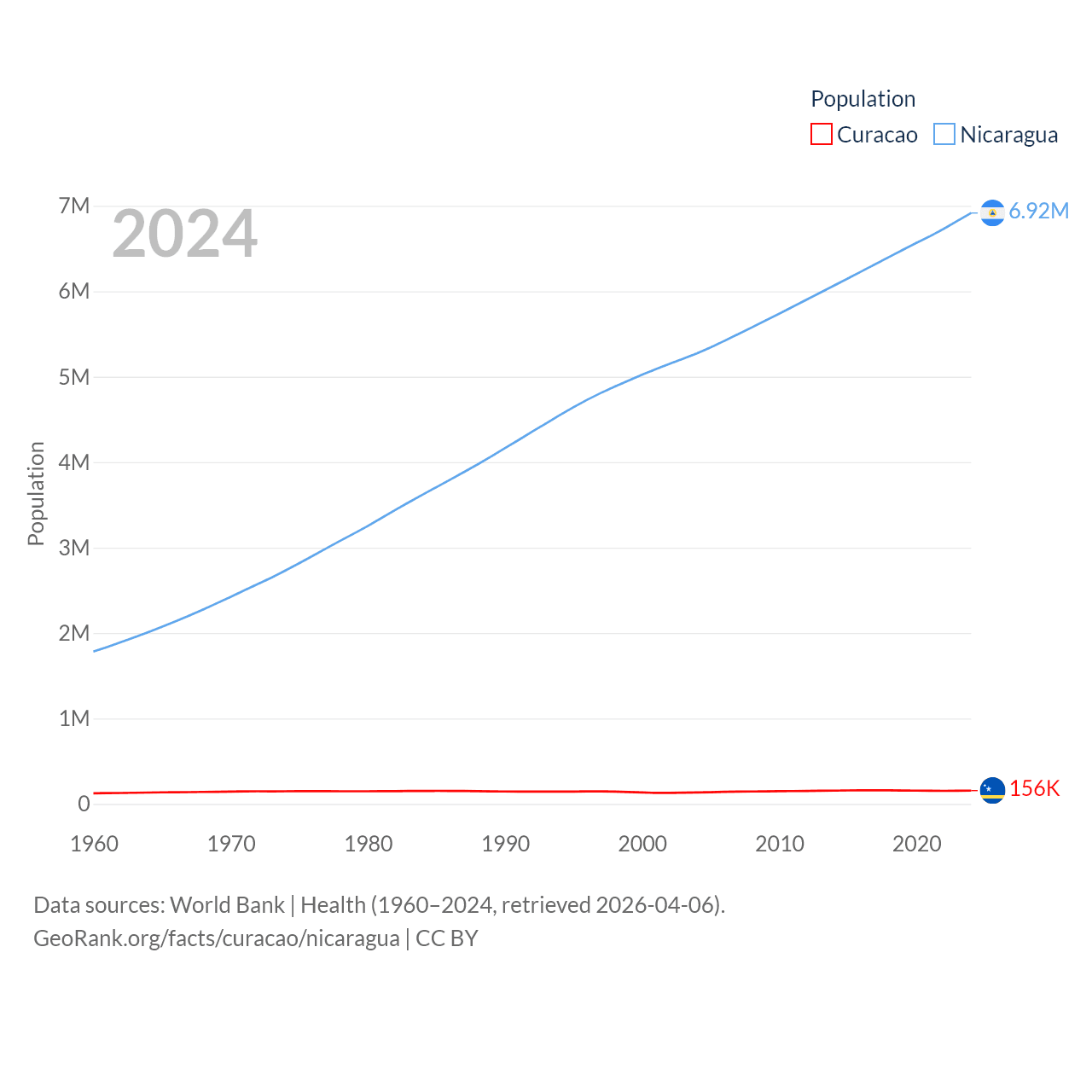 Curacao has a population of 156K (ranked 179/197), compared with 6.92M in Nicaragua (ranked 108/197). Curacao's land area is 171.4 sq mi versus 46,464 sq mi for Nicaragua (ranked 182nd vs. 98th).