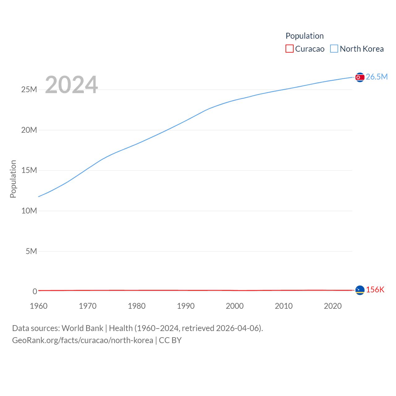 Curacao has a population of 156K (ranked 179/197), compared with 26.5M in North Korea (ranked 56/197). Curacao's land area is 171.4 sq mi versus 46,491 sq mi for North Korea (ranked 182nd vs. 97th).