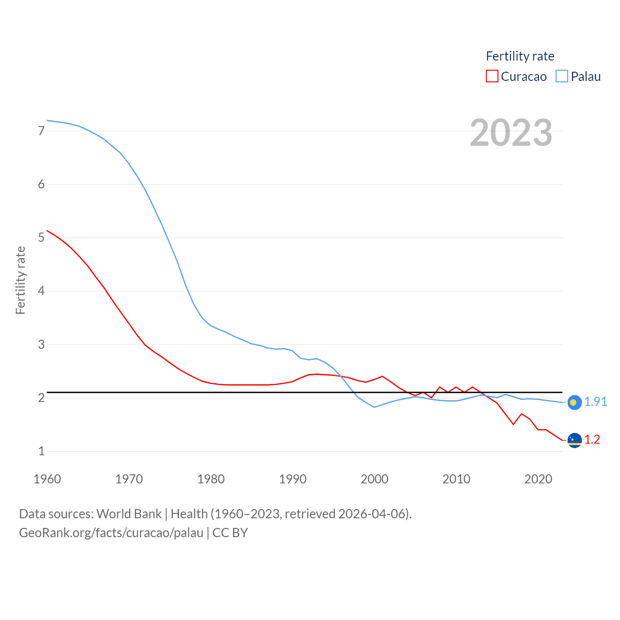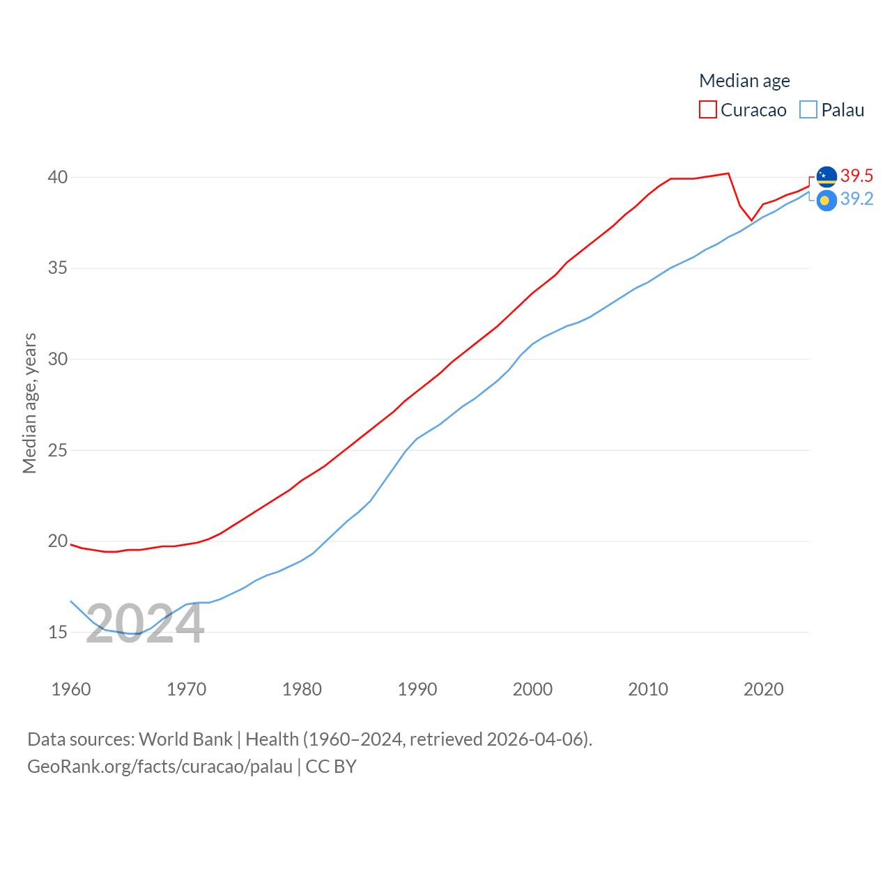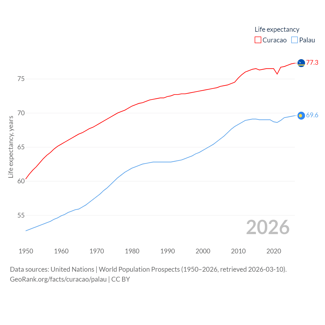 Curacao has a population of 156K (ranked 179/197), compared with 17.7K in Palau (ranked 194/197). Curacao's land area is 171.4 sq mi versus 177.6 sq mi for Palau (ranked 182nd vs. 180th).
