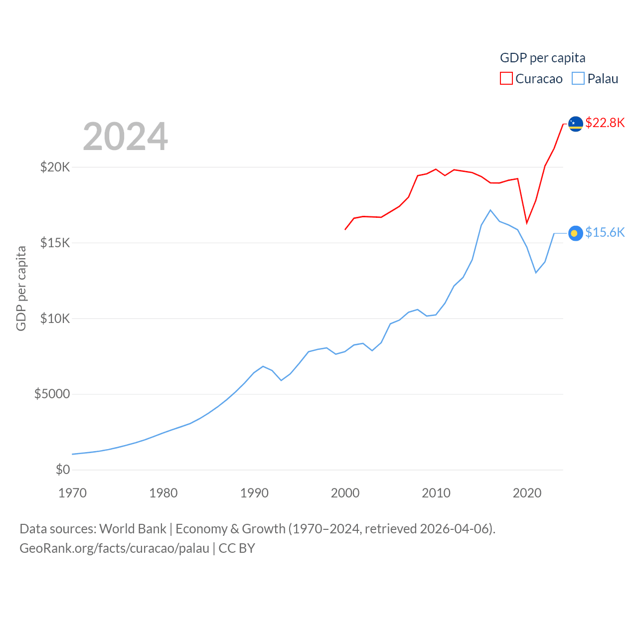 By GDP, Curacao ranks 167/197 ($3.56B) and Palau ranks 194/197 ($277M). By GDP per capita, Curacao ranks 56/197 ($22,833), while Palau ranks 67/197 ($15,611).
