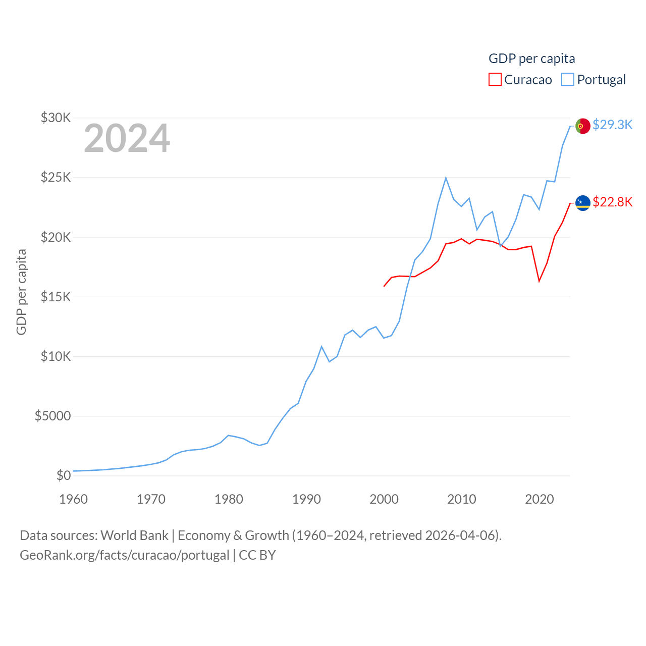 By GDP, Curacao ranks 167/197 ($3.56B) and Portugal ranks 46/197 ($313B). By GDP per capita, Curacao ranks 56/197 ($22,833), while Portugal ranks 44/197 ($29,292).