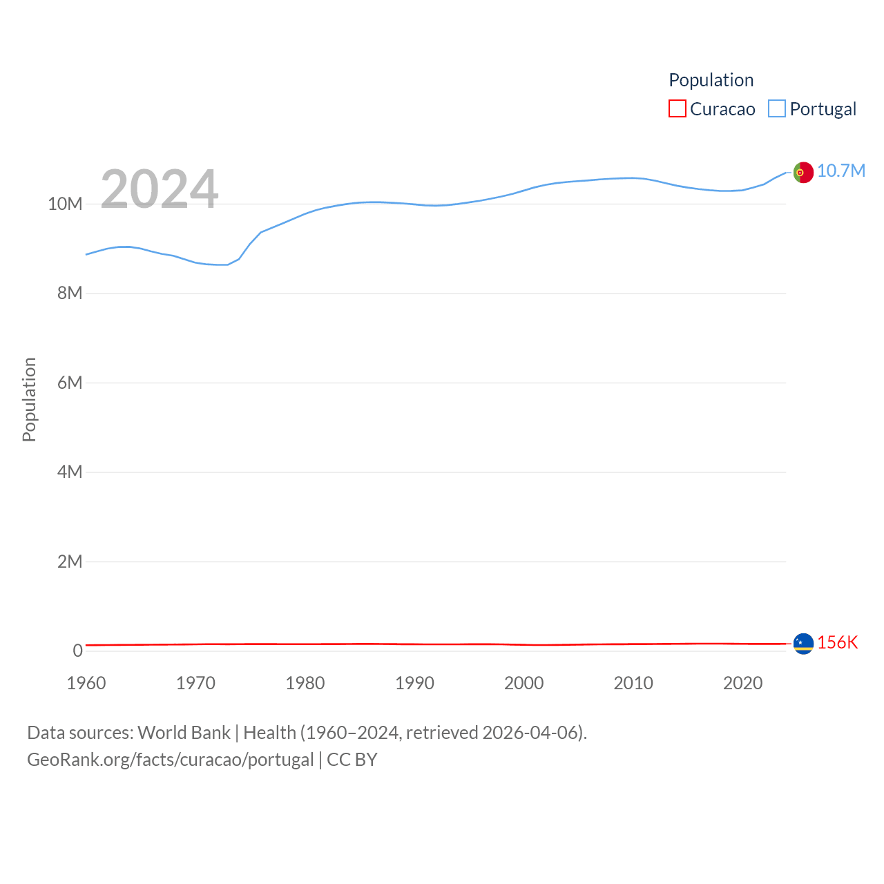 Curacao has a population of 156K (ranked 179/197), compared with 10.7M in Portugal (ranked 90/197). Curacao's land area is 171.4 sq mi versus 35,369 sq mi for Portugal (ranked 182nd vs. 108th).