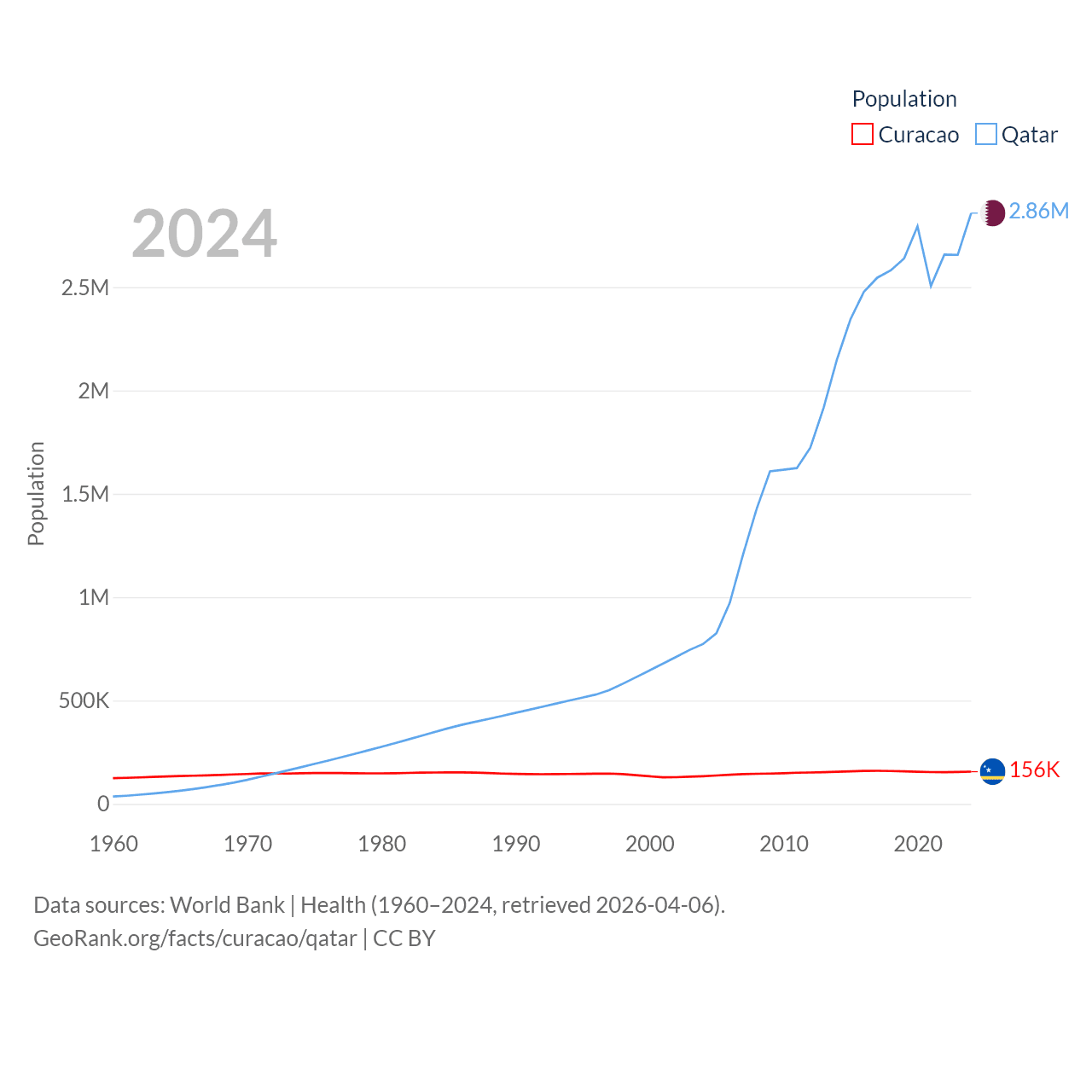 Curacao has a population of 156K (ranked 179/197), compared with 2.86M in Qatar (ranked 138/197). Curacao's land area is 171.4 sq mi versus 4,436 sq mi for Qatar (ranked 182nd vs. 158th).