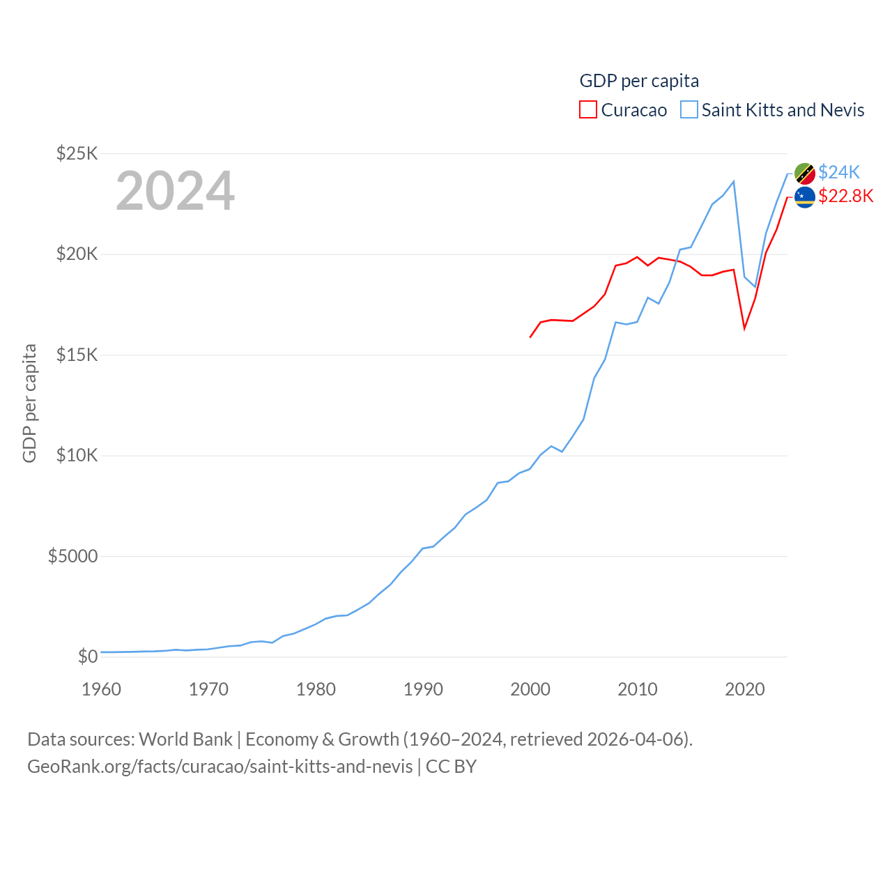 By GDP, Curacao ranks 167/197 ($3.56B) and Saint Kitts and Nevis ranks 187/197 ($1.12B). By GDP per capita, Curacao ranks 56/197 ($22,833), while Saint Kitts and Nevis ranks 51/197 ($23,961).