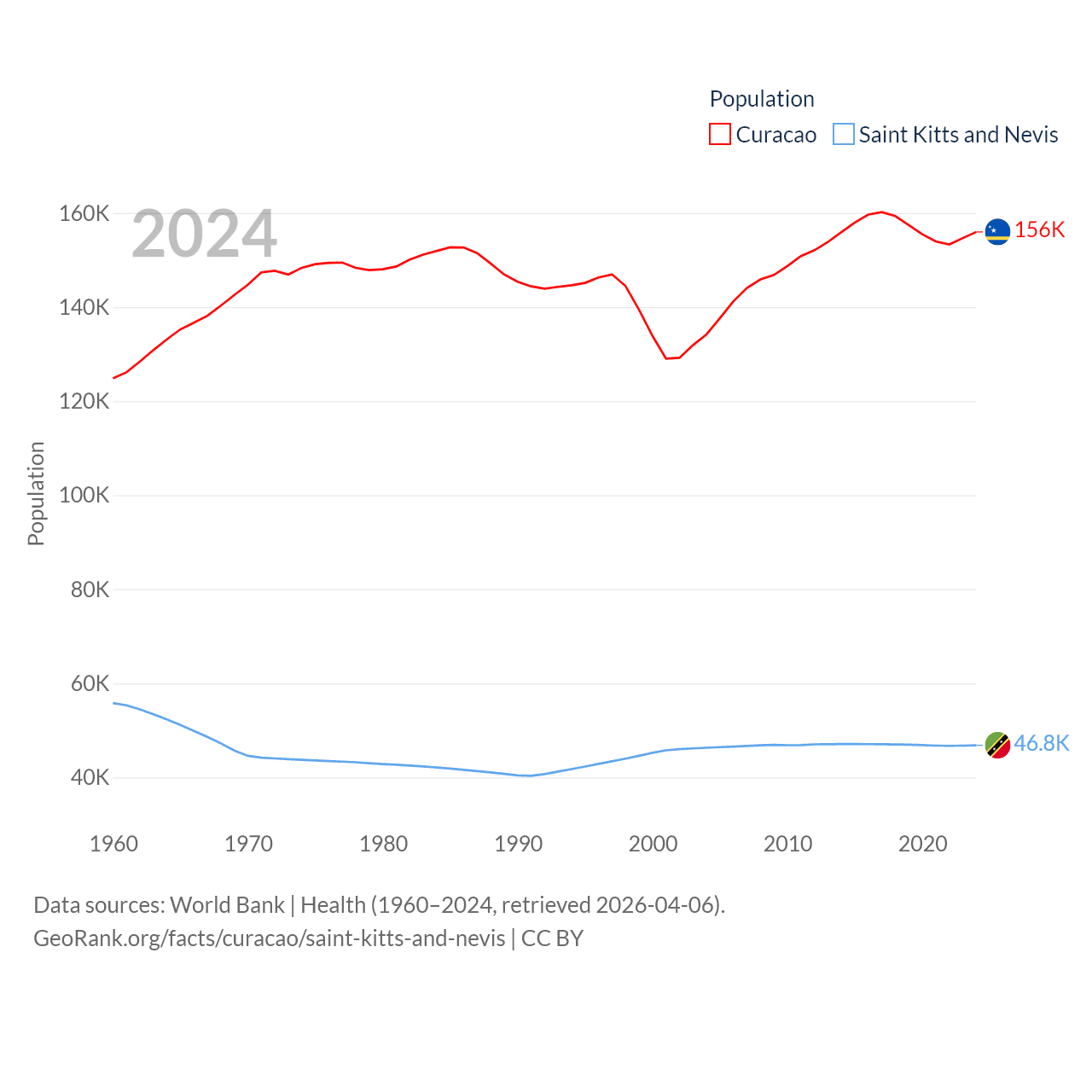 Curacao has a population of 156K (ranked 179/197), compared with 46.8K in Saint Kitts and Nevis (ranked 189/197). Curacao's land area is 171.4 sq mi versus 100.4 sq mi for Saint Kitts and Nevis (ranked 182nd vs. 189th).