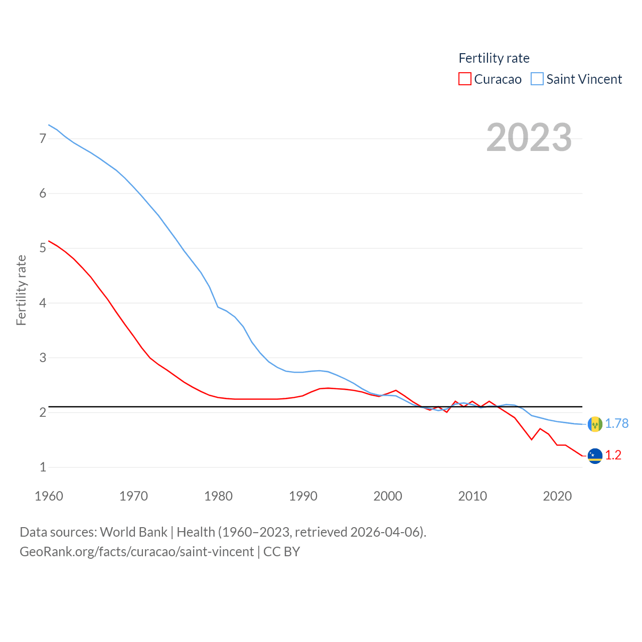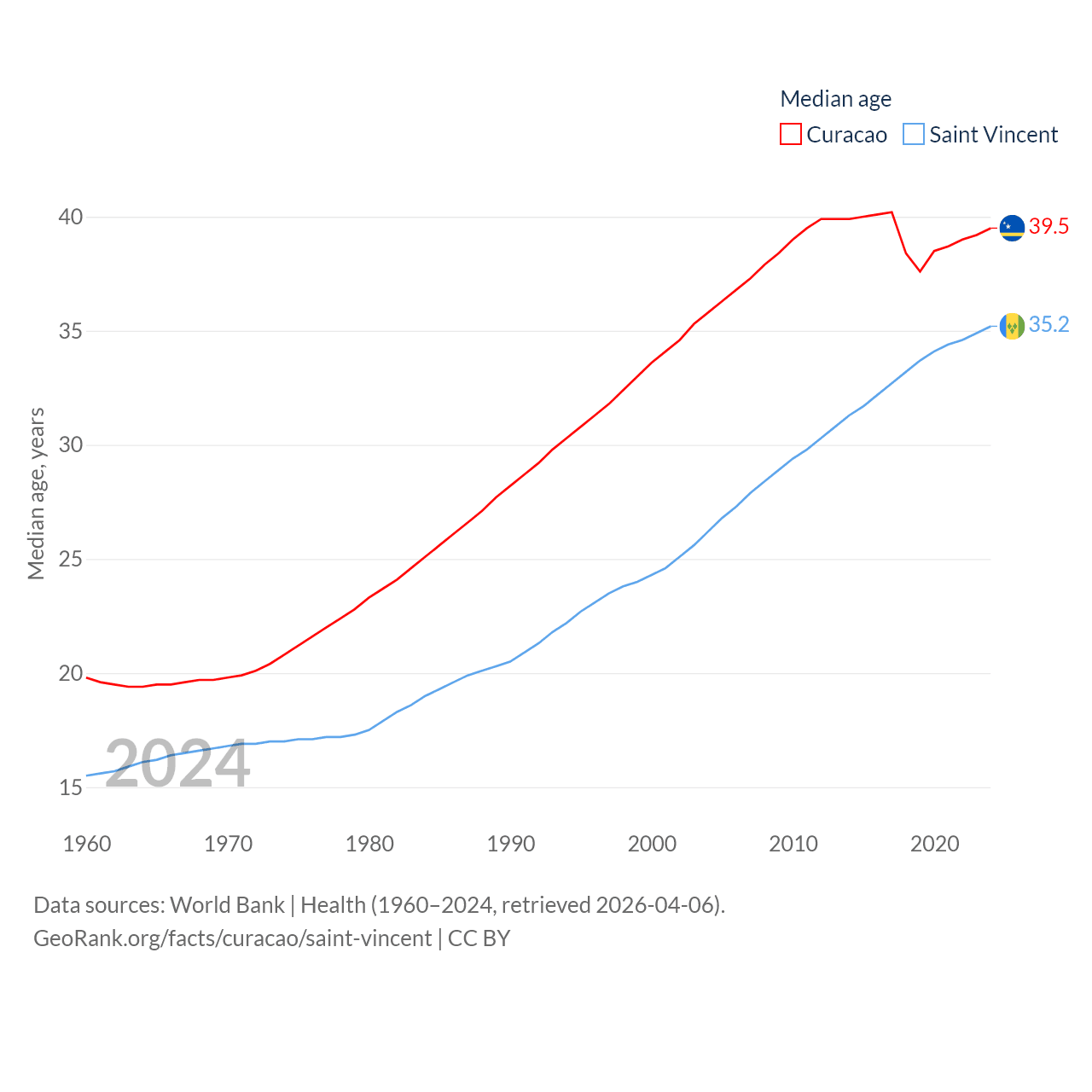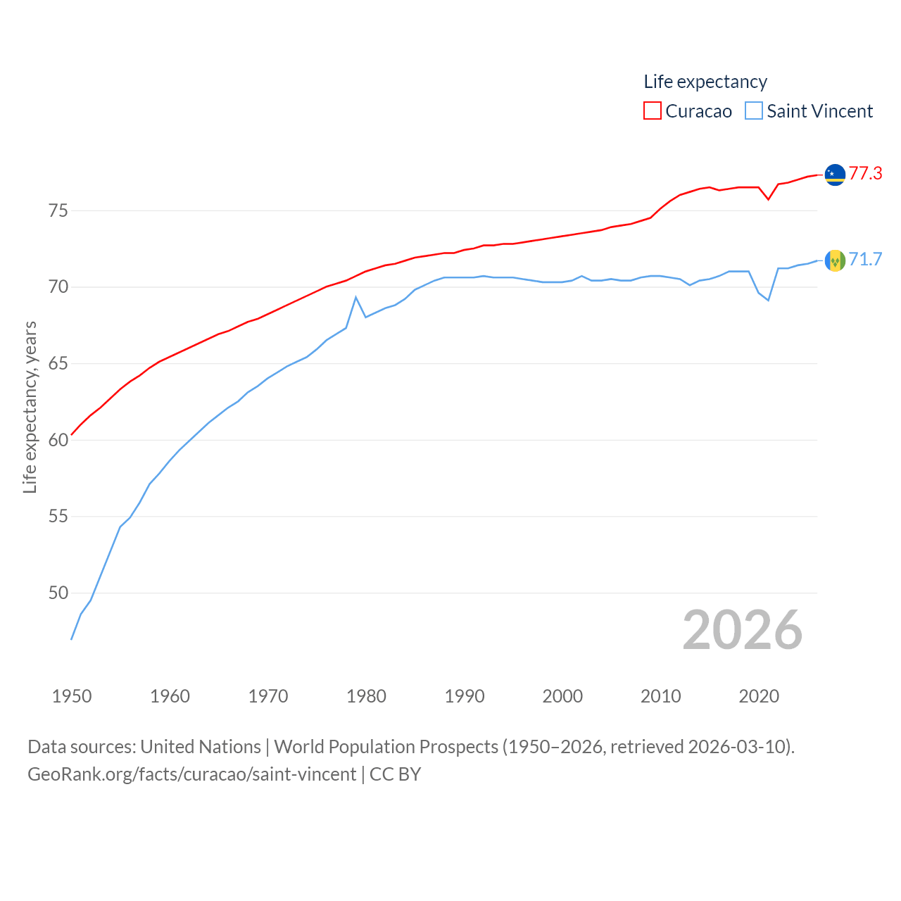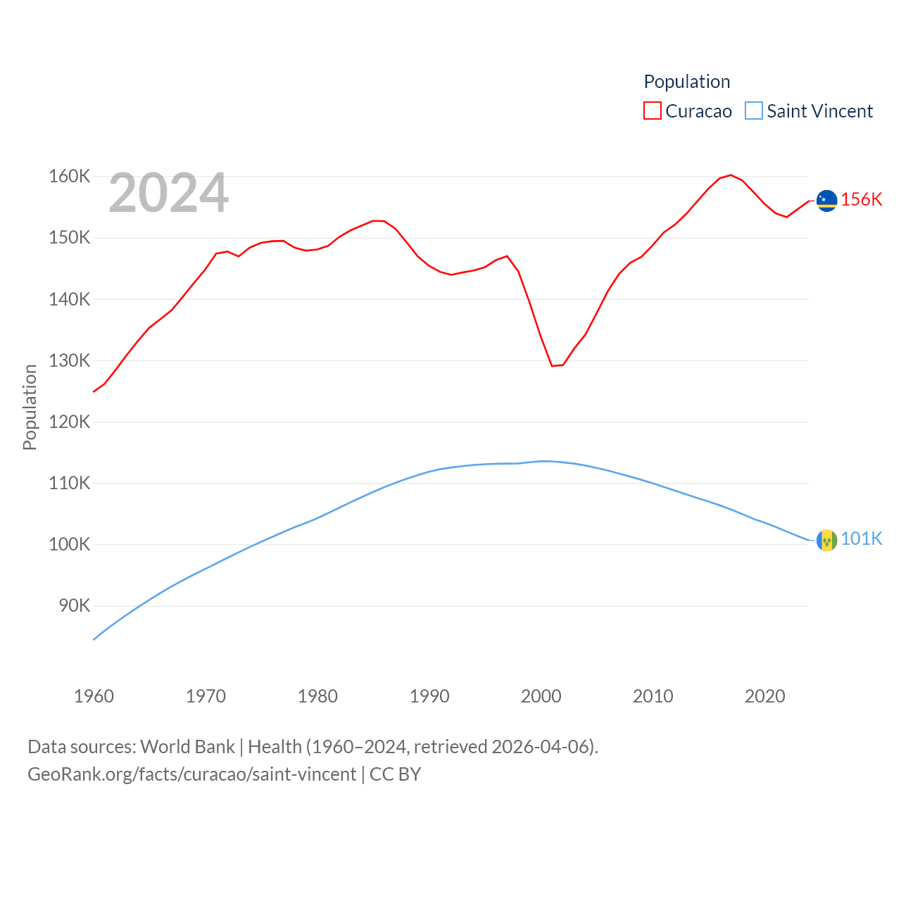 Curacao has a population of 156K (ranked 179/197), compared with 101K in Saint Vincent (ranked 184/197). Curacao's land area is 171.4 sq mi versus 150.6 sq mi for Saint Vincent (ranked 182nd vs. 185th).