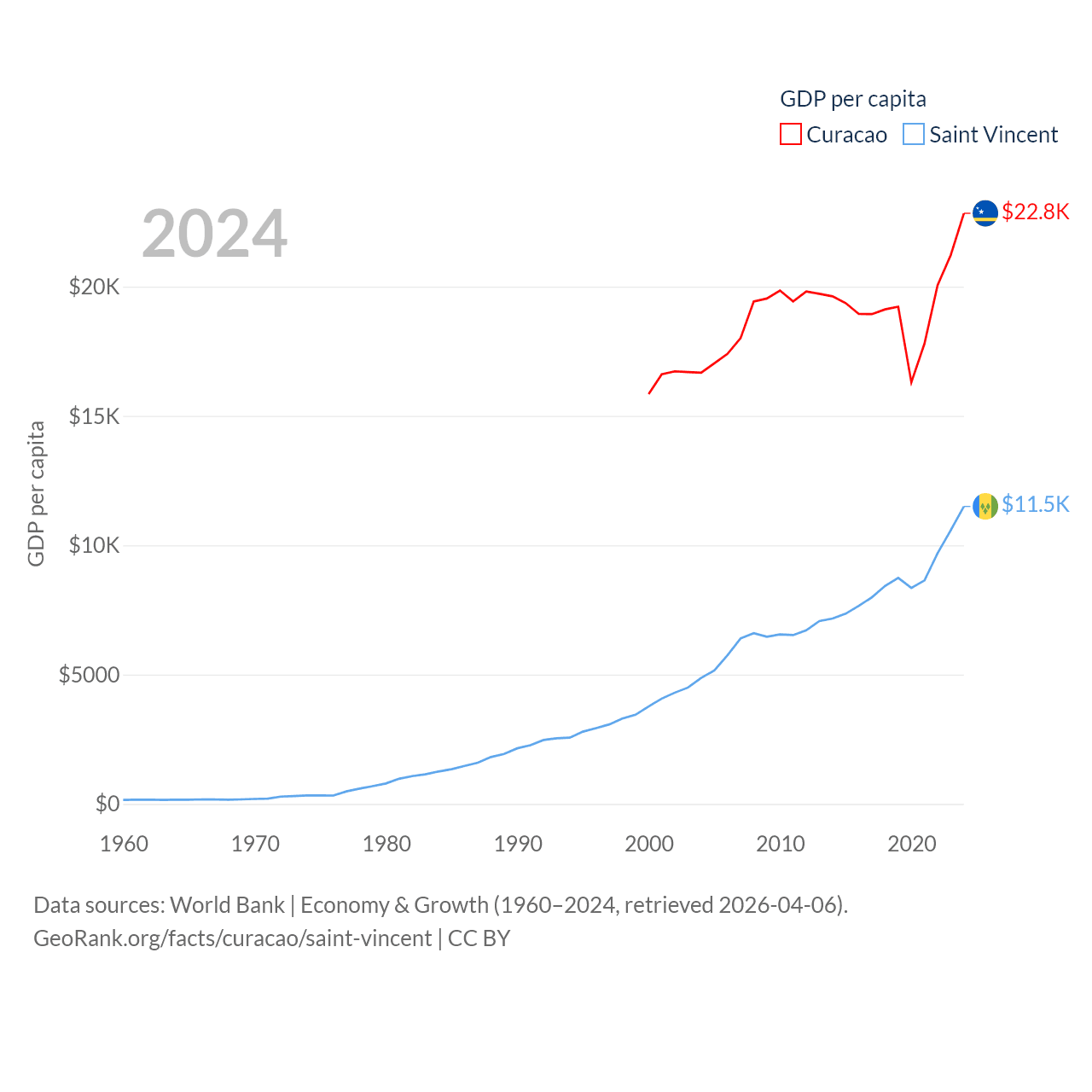 By GDP, Curacao ranks 167/197 ($3.56B) and Saint Vincent ranks 186/197 ($1.16B). By GDP per capita, Curacao ranks 56/197 ($22,833), while Saint Vincent ranks 81/197 ($11,501).