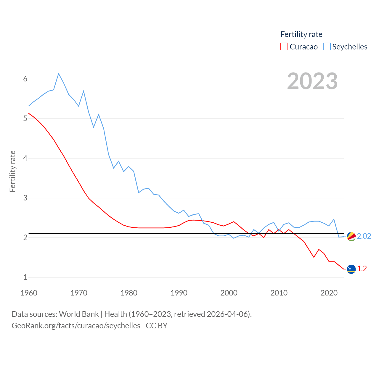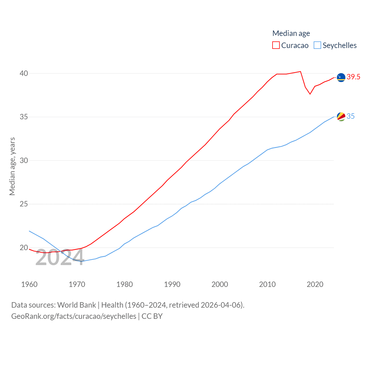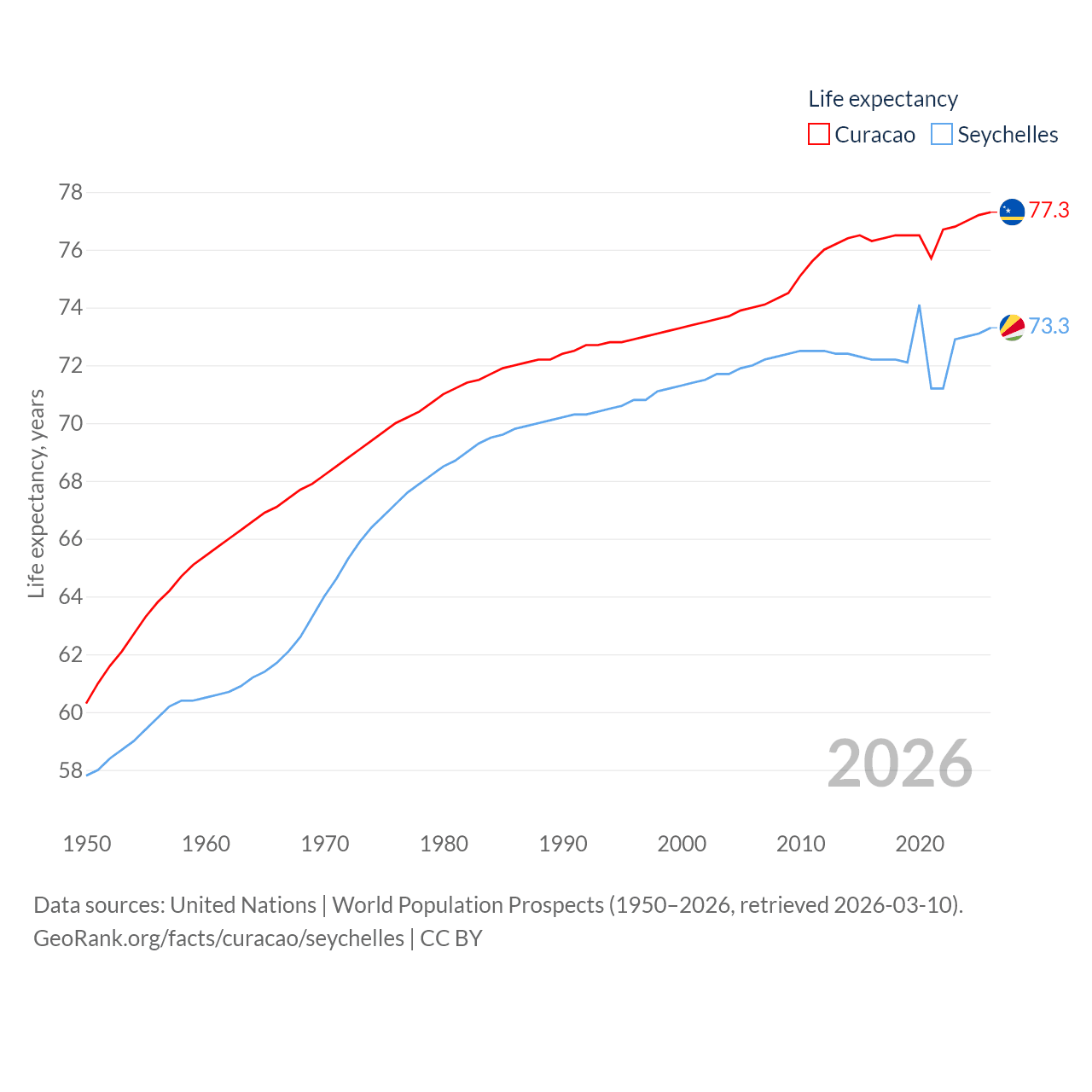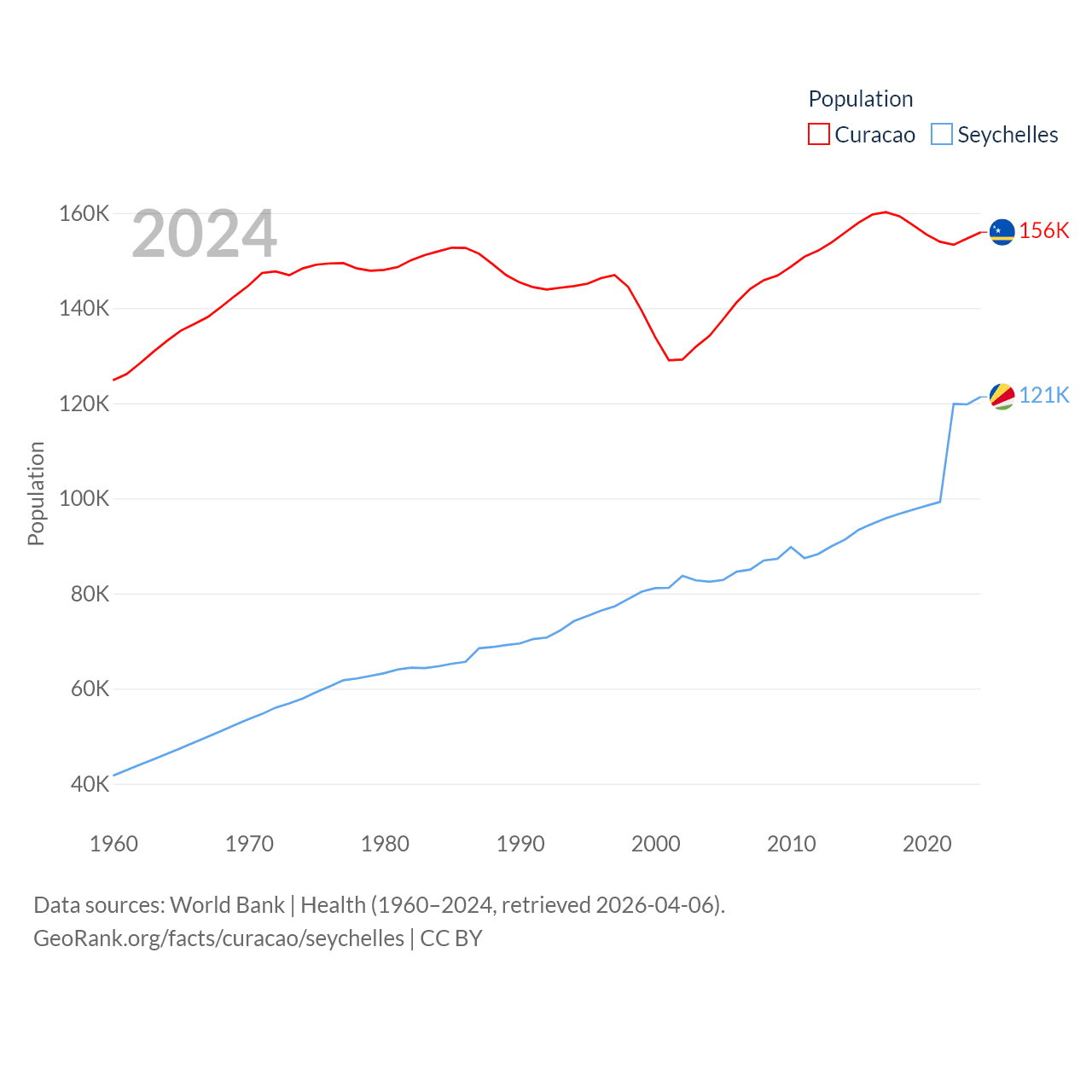 Curacao has a population of 156K (ranked 179/197), compared with 121K in The Seychelles (ranked 181/197). Curacao's land area is 171.4 sq mi versus 177.6 sq mi for The Seychelles (ranked 182nd vs. 181st).