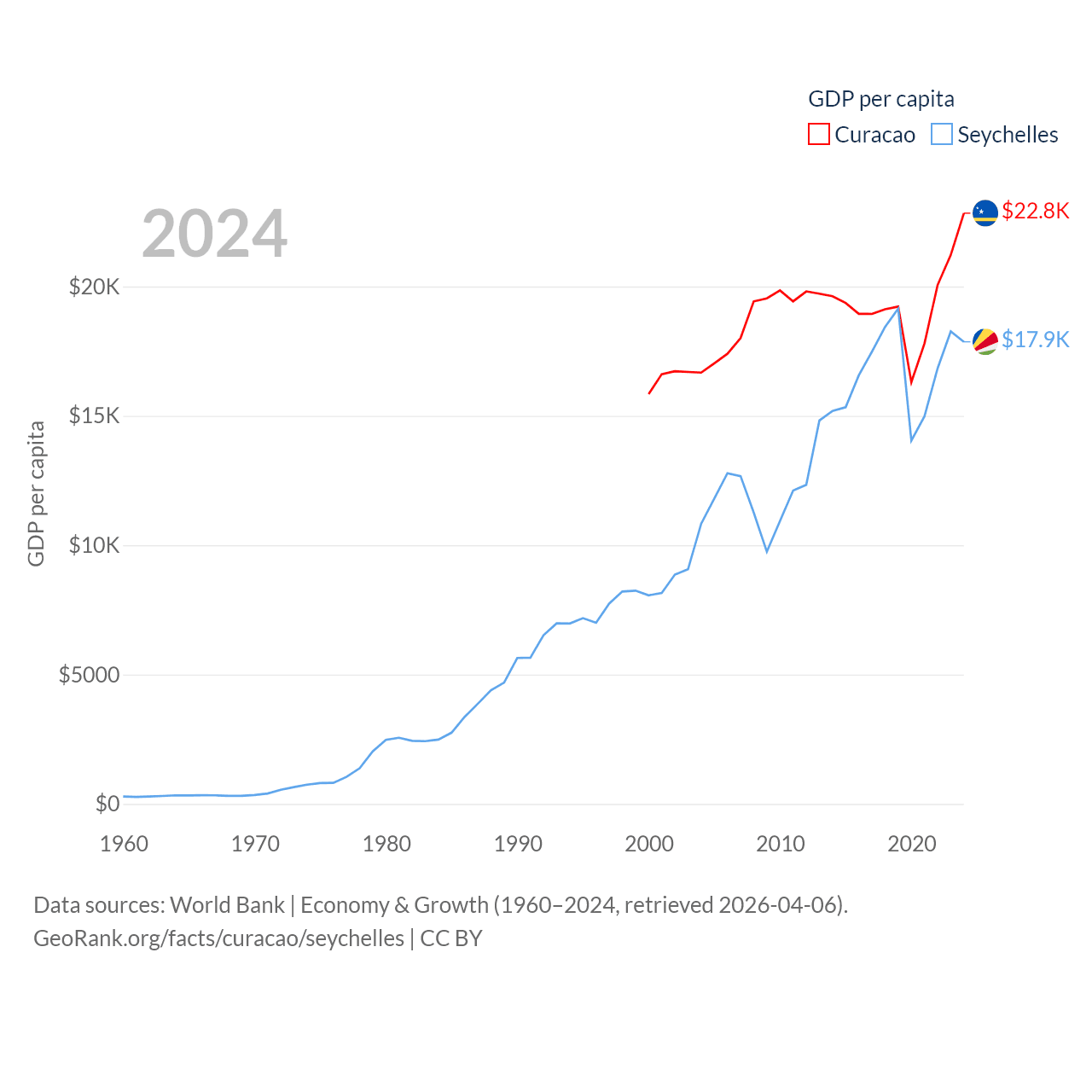 By GDP, Curacao ranks 167/197 ($3.56B) and The Seychelles ranks 178/197 ($2.17B). By GDP per capita, Curacao ranks 56/197 ($22,833), while The Seychelles ranks 63/197 ($17,859).