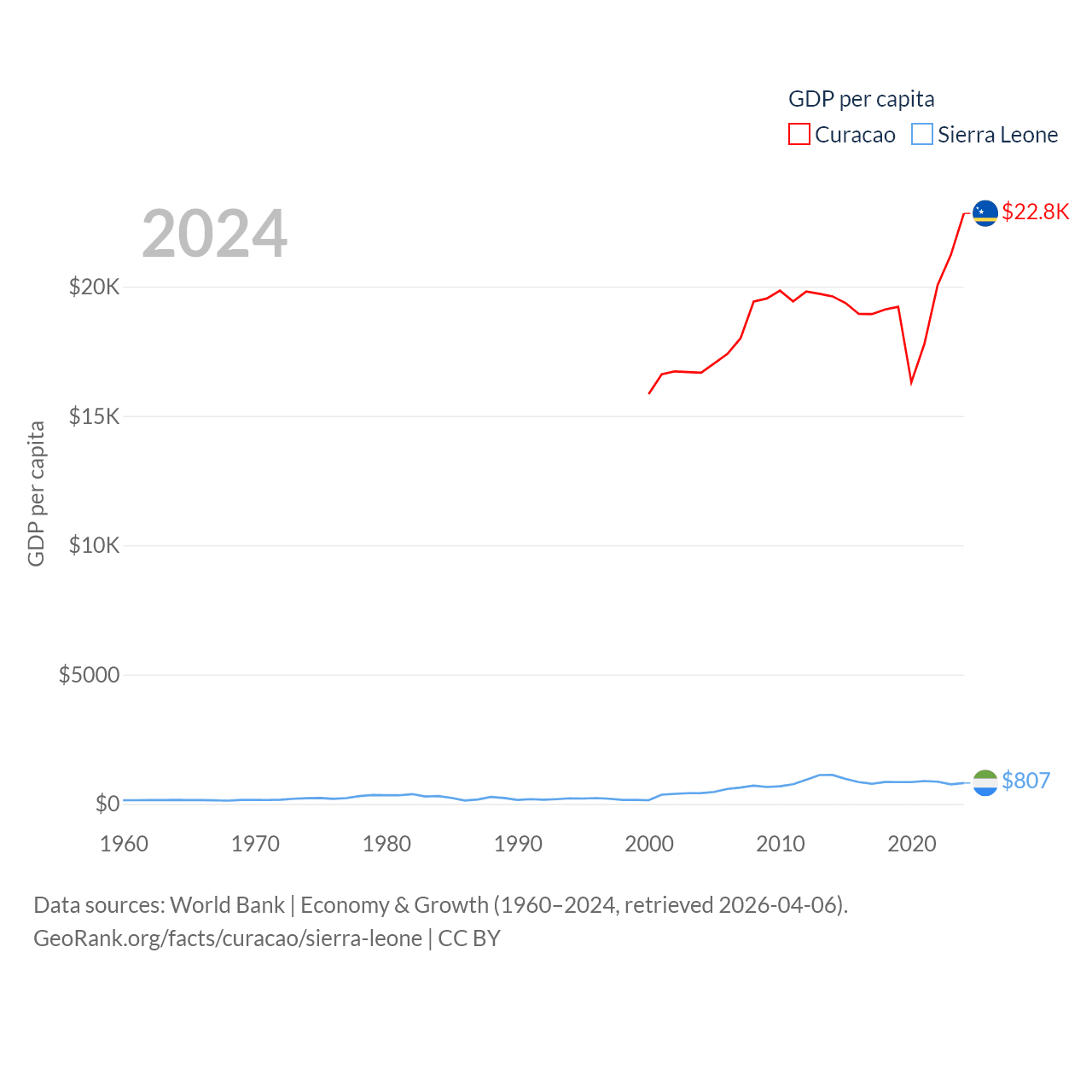 By GDP, Curacao ranks 167/197 ($3.56B) and Sierra Leone ranks 160/197 ($6.97B). By GDP per capita, Curacao ranks 56/197 ($22,833), while Sierra Leone ranks 186/197 ($807).