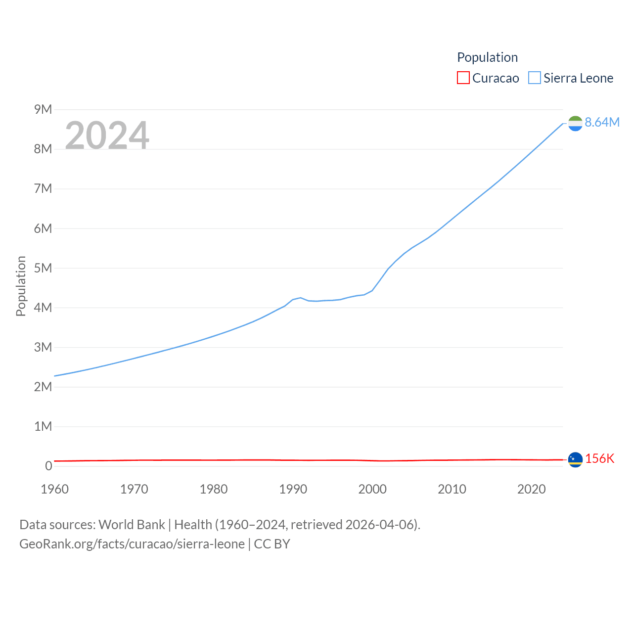 Curacao has a population of 156K (ranked 179/197), compared with 8.64M in Sierra Leone (ranked 102/197). Curacao's land area is 171.4 sq mi versus 27,869 sq mi for Sierra Leone (ranked 182nd vs. 116th).