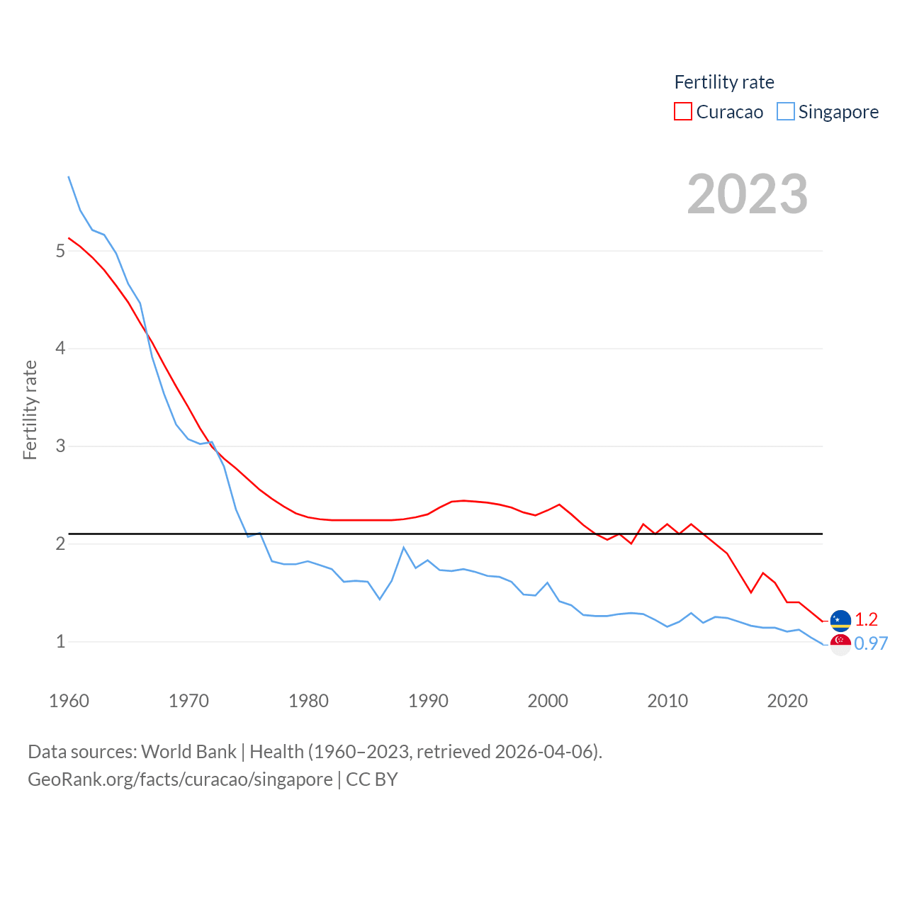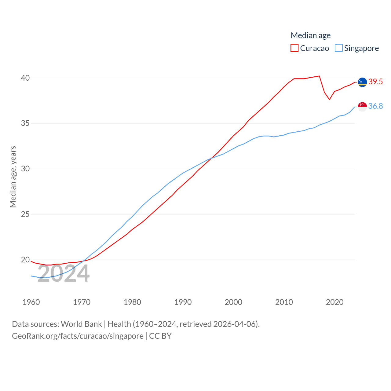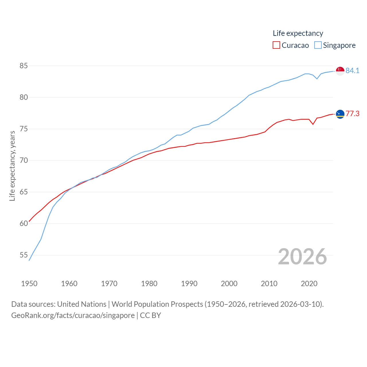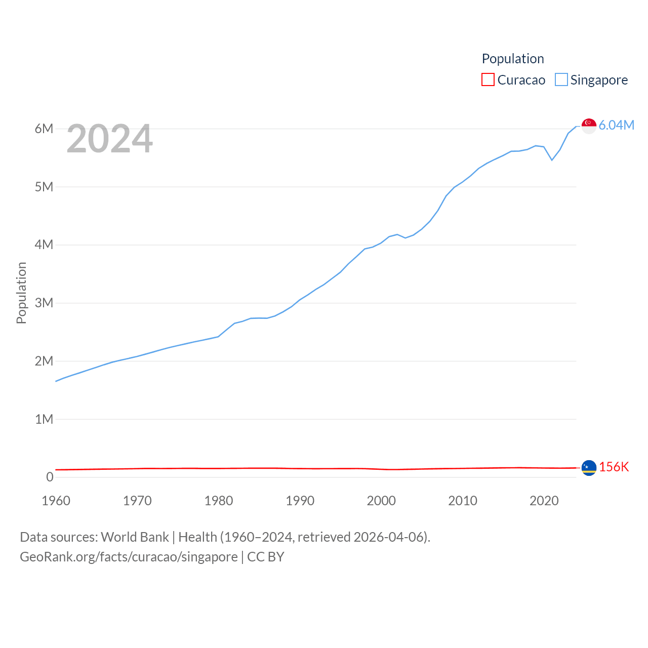 Curacao has a population of 156K (ranked 179/197), compared with 6.04M in Singapore (ranked 113/197). Curacao's land area is 171.4 sq mi versus 277.2 sq mi for Singapore (ranked 182nd vs. 177th).