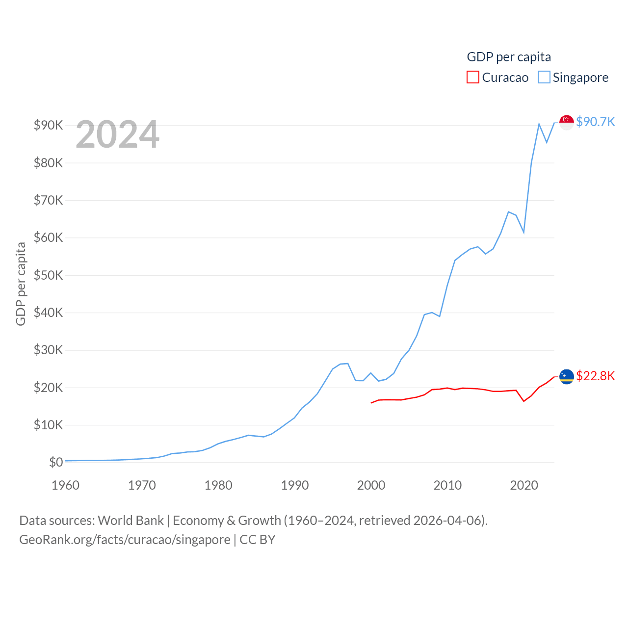 By GDP, Curacao ranks 167/197 ($3.56B) and Singapore ranks 28/197 ($547B). By GDP per capita, Curacao ranks 56/197 ($22,833), while Singapore ranks 7/197 ($90,674).