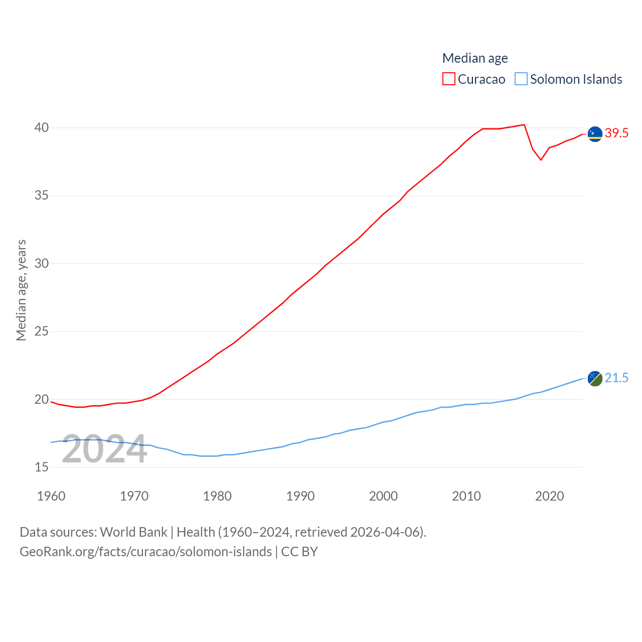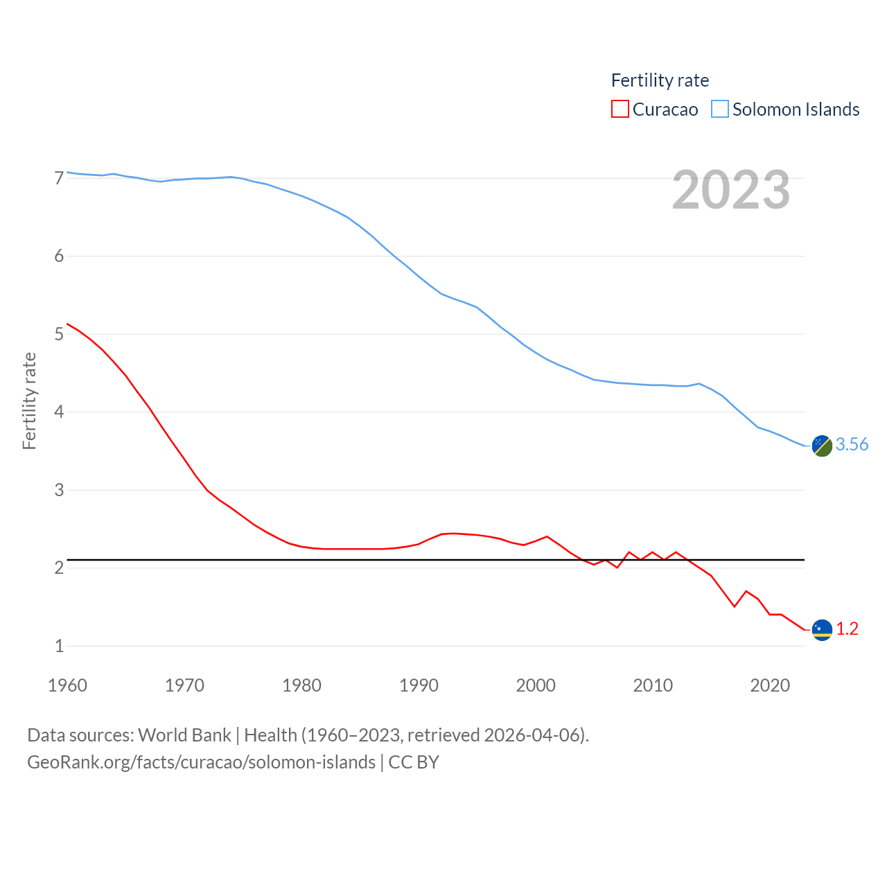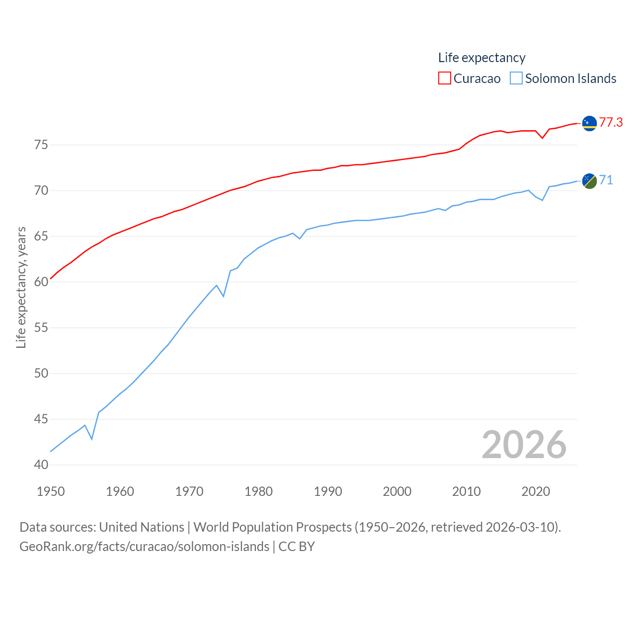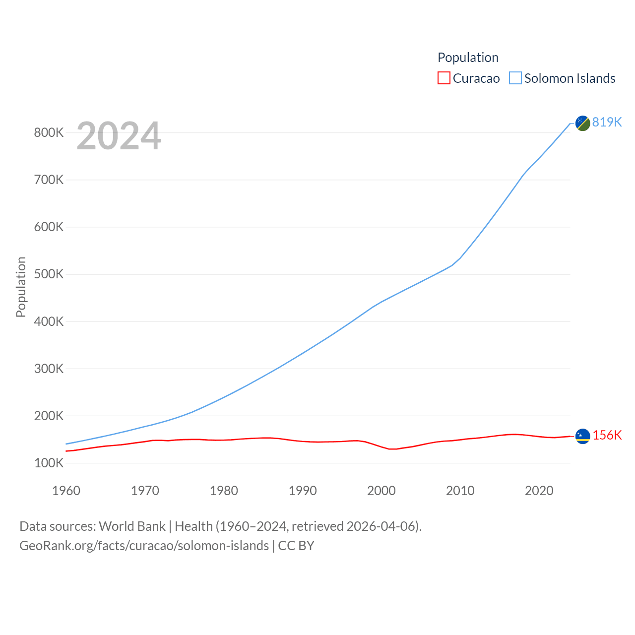 Curacao has a population of 156K (ranked 179/197), compared with 819K in The Solomon Islands (ranked 162/197). Curacao's land area is 171.4 sq mi versus 10,807 sq mi for The Solomon Islands (ranked 182nd vs. 141st).