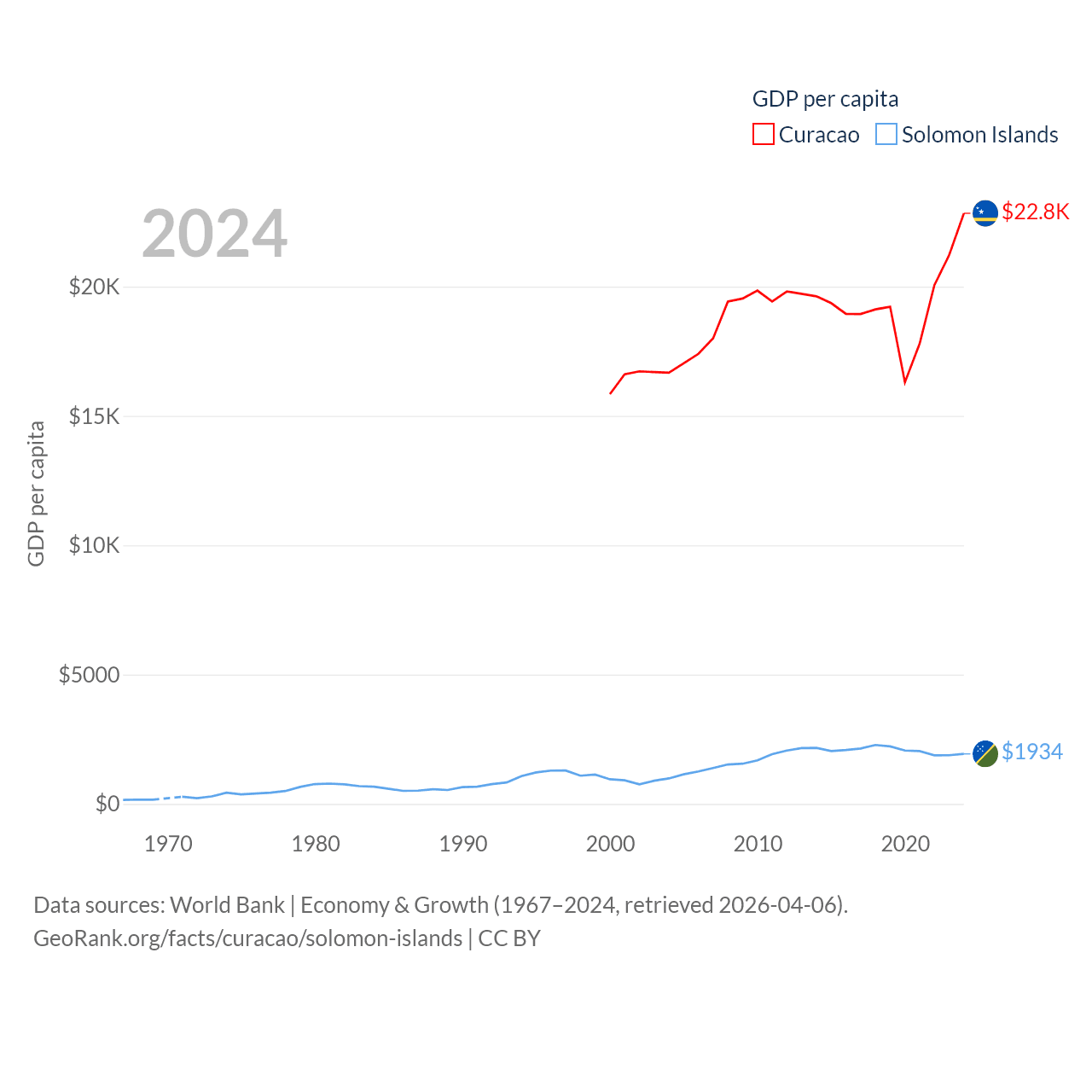 By GDP, Curacao ranks 167/197 ($3.56B) and The Solomon Islands ranks 182/197 ($1.58B). By GDP per capita, Curacao ranks 56/197 ($22,833), while The Solomon Islands ranks 157/197 ($1,934).