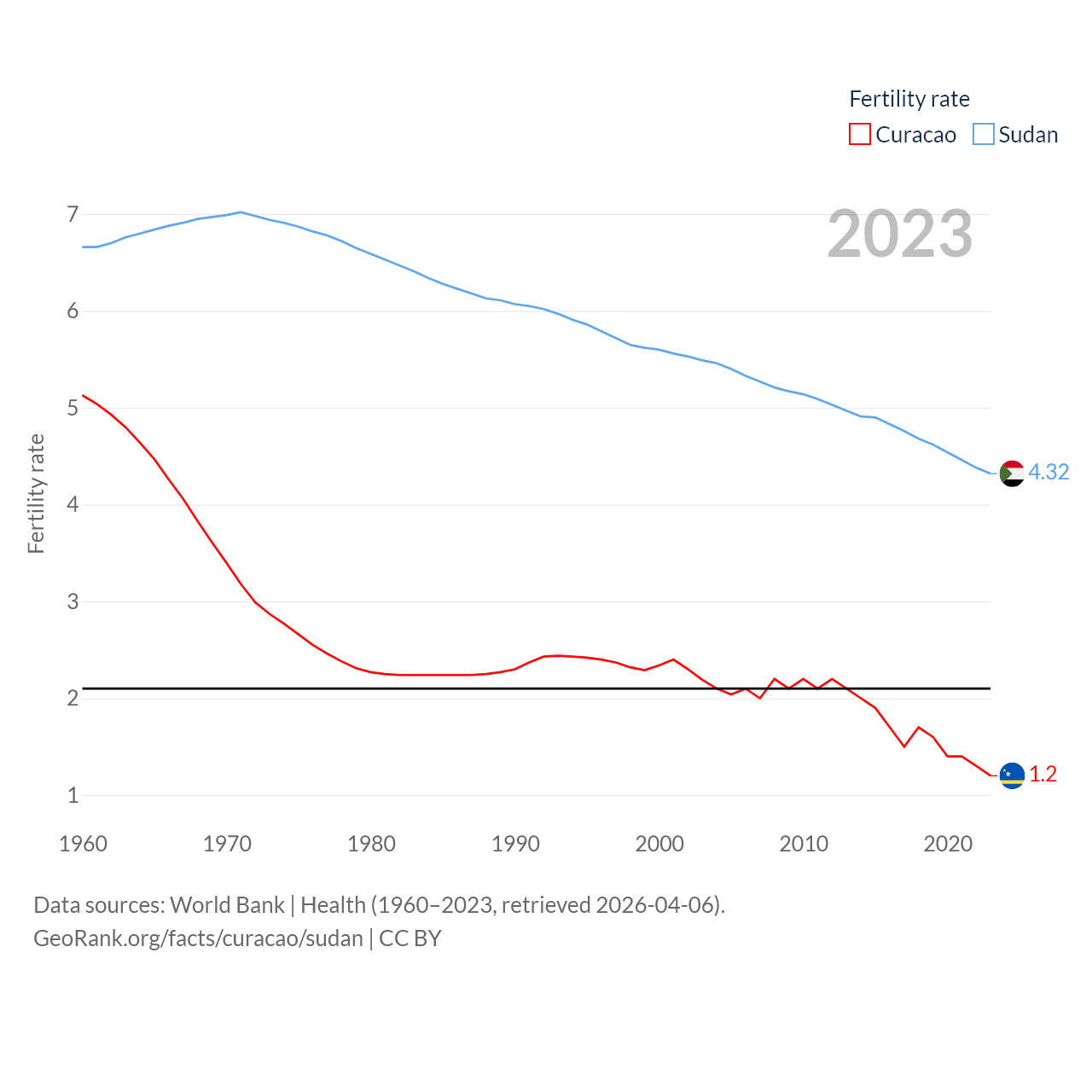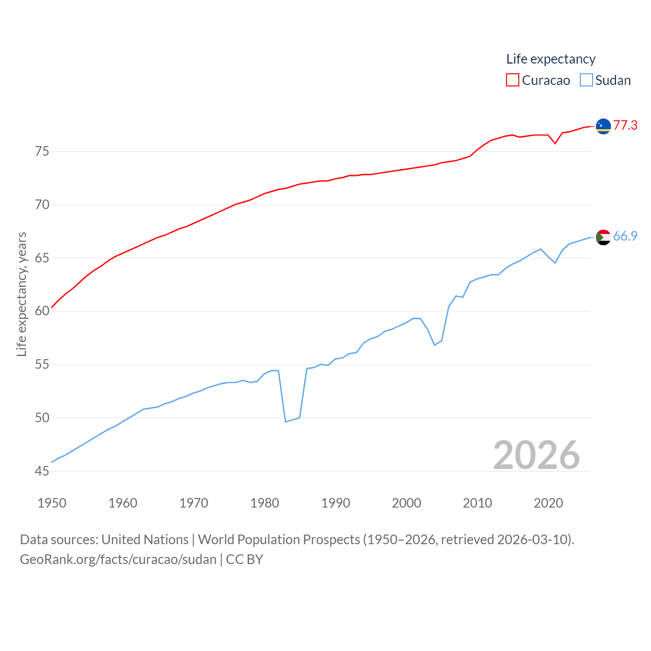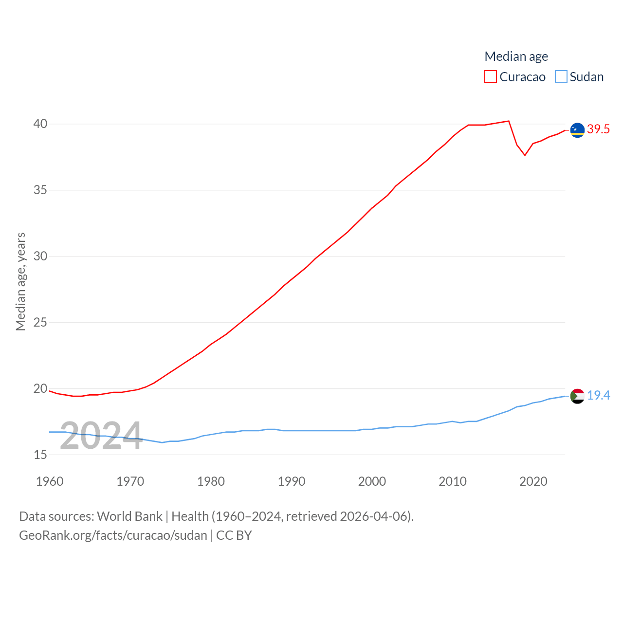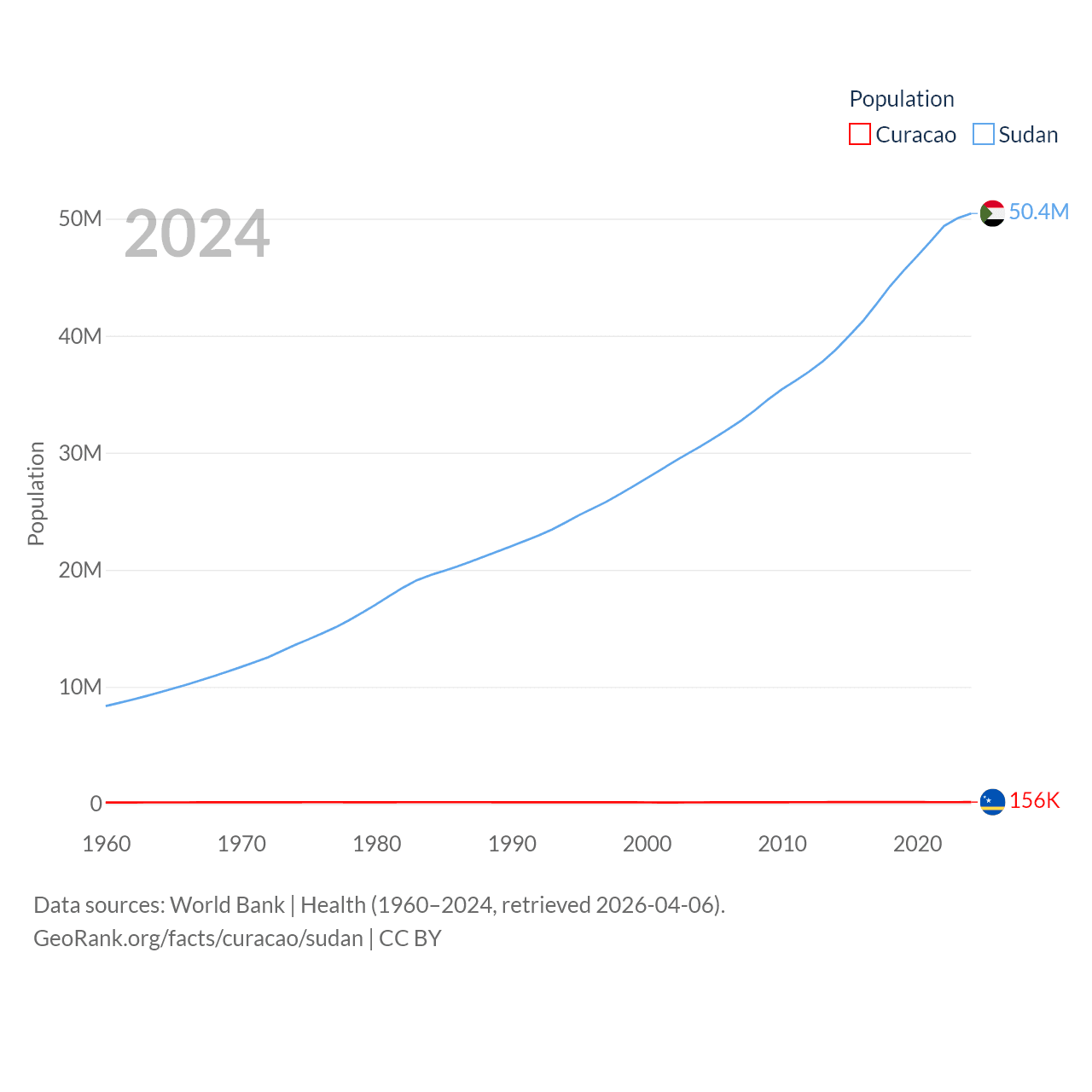 Curacao has a population of 156K (ranked 179/197), compared with 50.4M in Sudan (ranked 30/197). Curacao's land area is 171.4 sq mi versus 721,239 sq mi for Sudan (ranked 182nd vs. 15th).