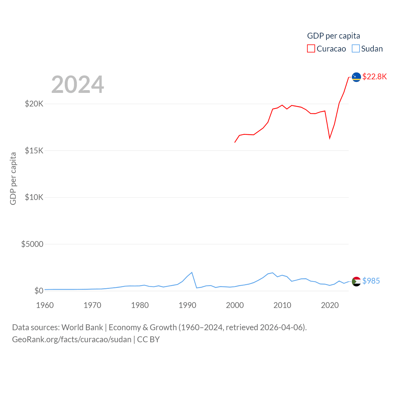 By GDP, Curacao ranks 167/197 ($3.56B) and Sudan ranks 94/197 ($49.7B). By GDP per capita, Curacao ranks 56/197 ($22,833), while Sudan ranks 179/197 ($985).