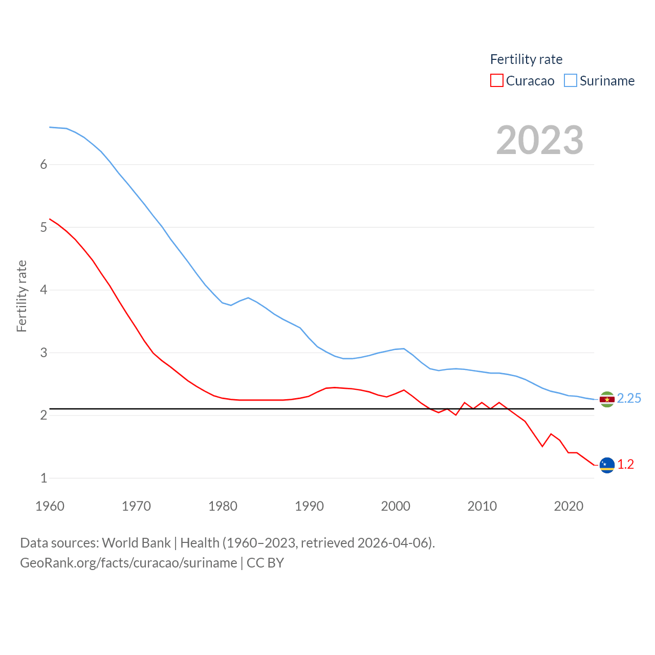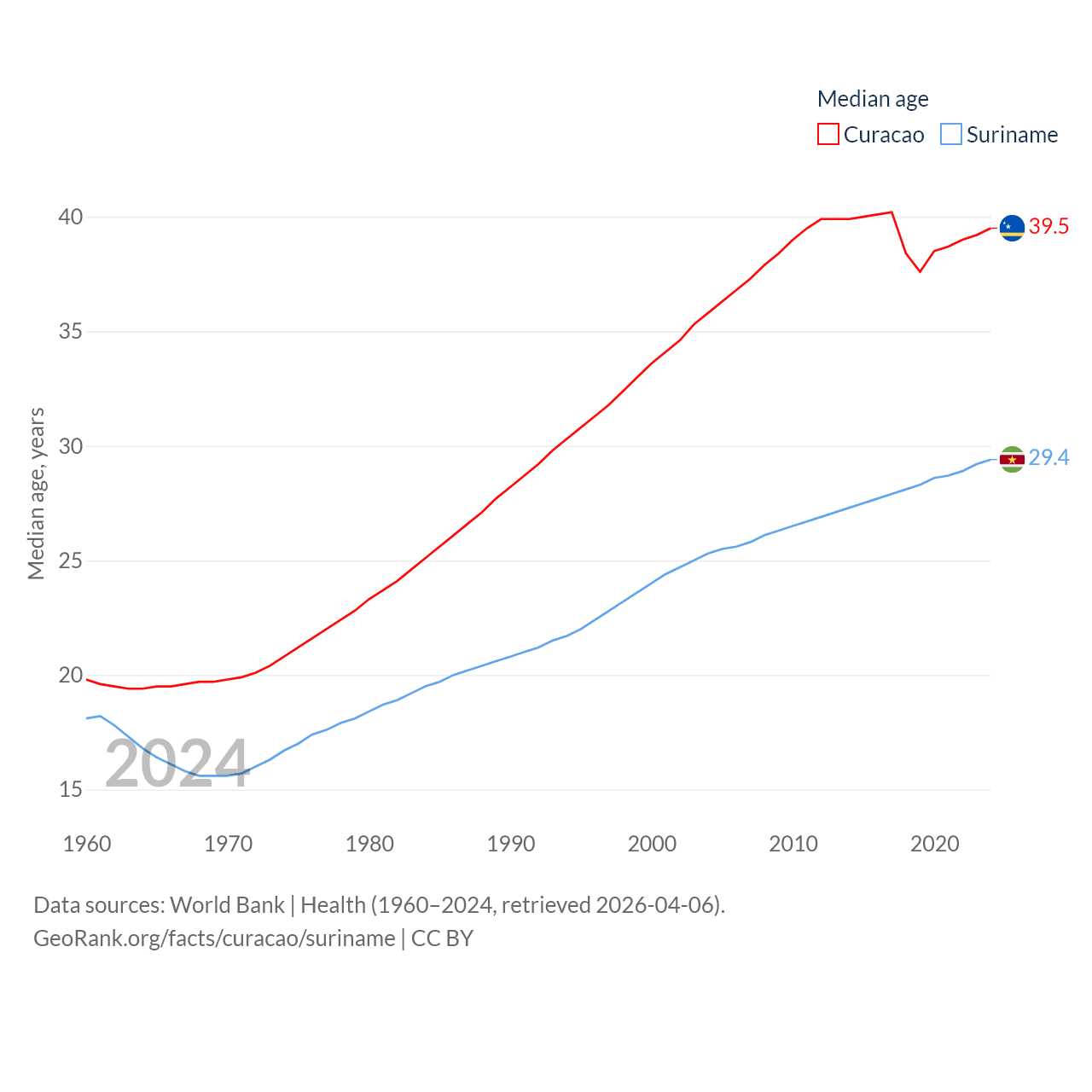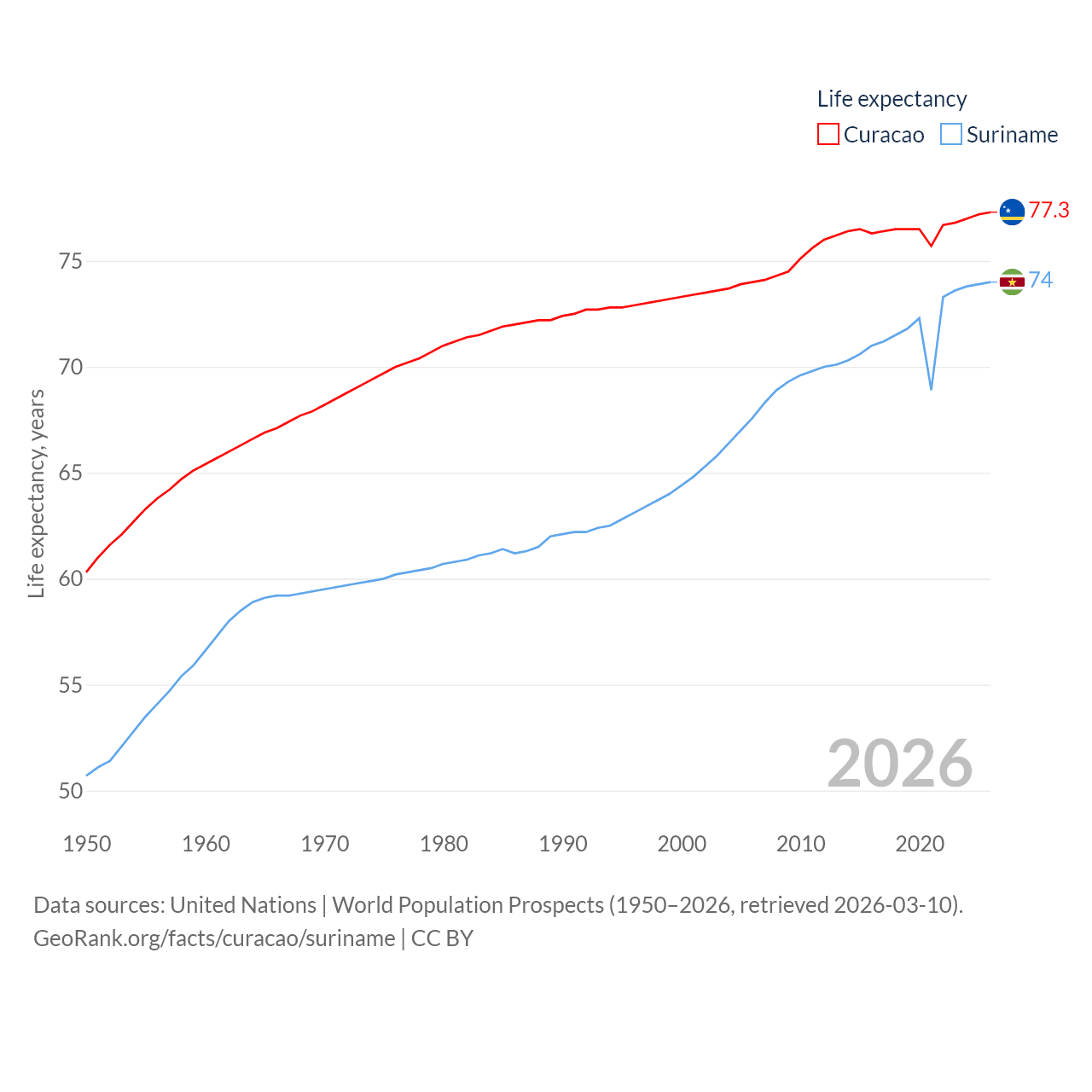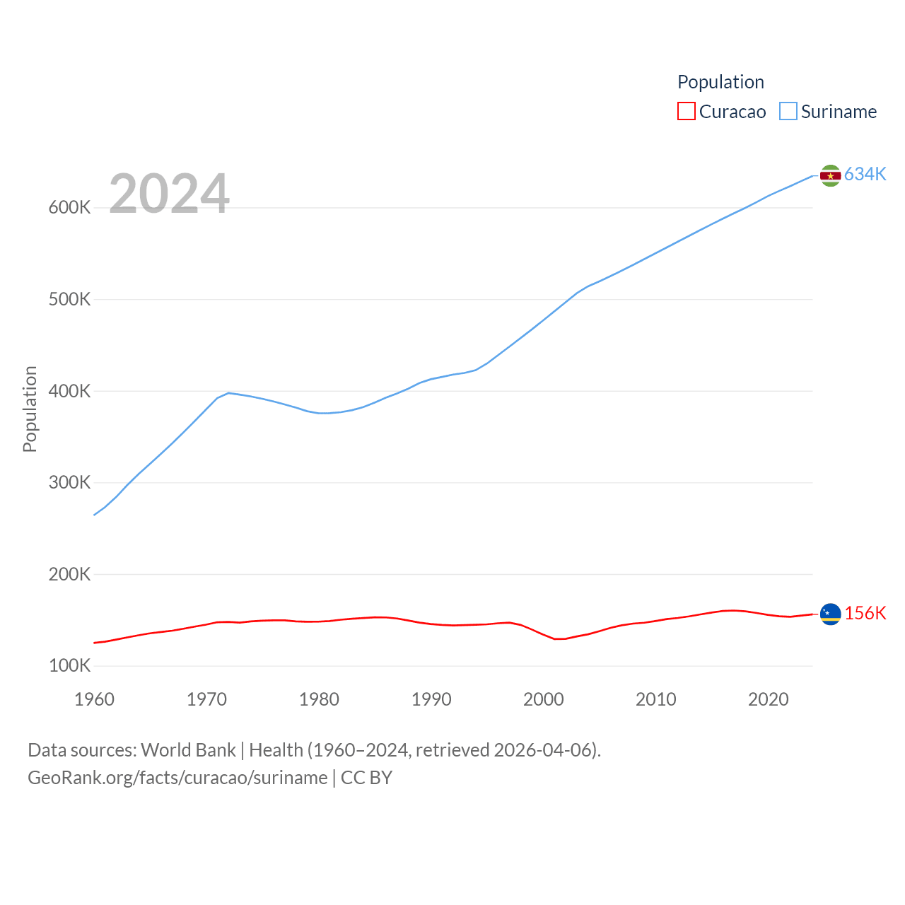 Curacao has a population of 156K (ranked 179/197), compared with 634K in Suriname (ranked 165/197). Curacao's land area is 171.4 sq mi versus 61,972 sq mi for Suriname (ranked 182nd vs. 90th).