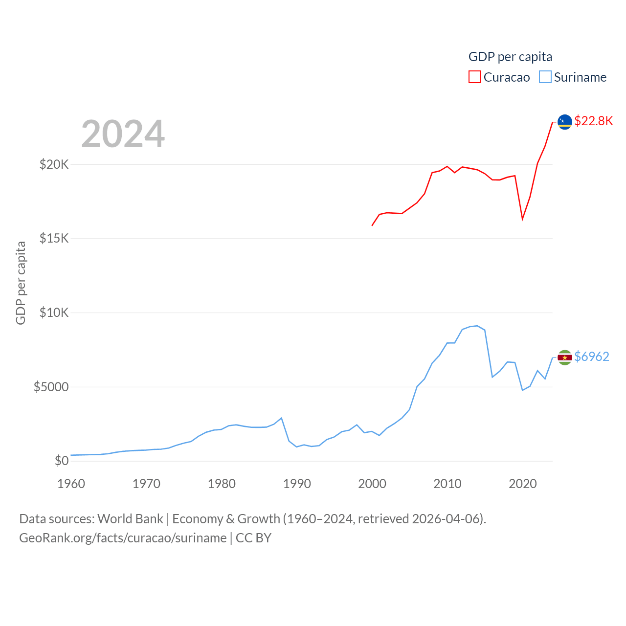 By GDP, Curacao ranks 167/197 ($3.56B) and Suriname ranks 164/197 ($4.42B). By GDP per capita, Curacao ranks 56/197 ($22,833), while Suriname ranks 102/197 ($6,962).