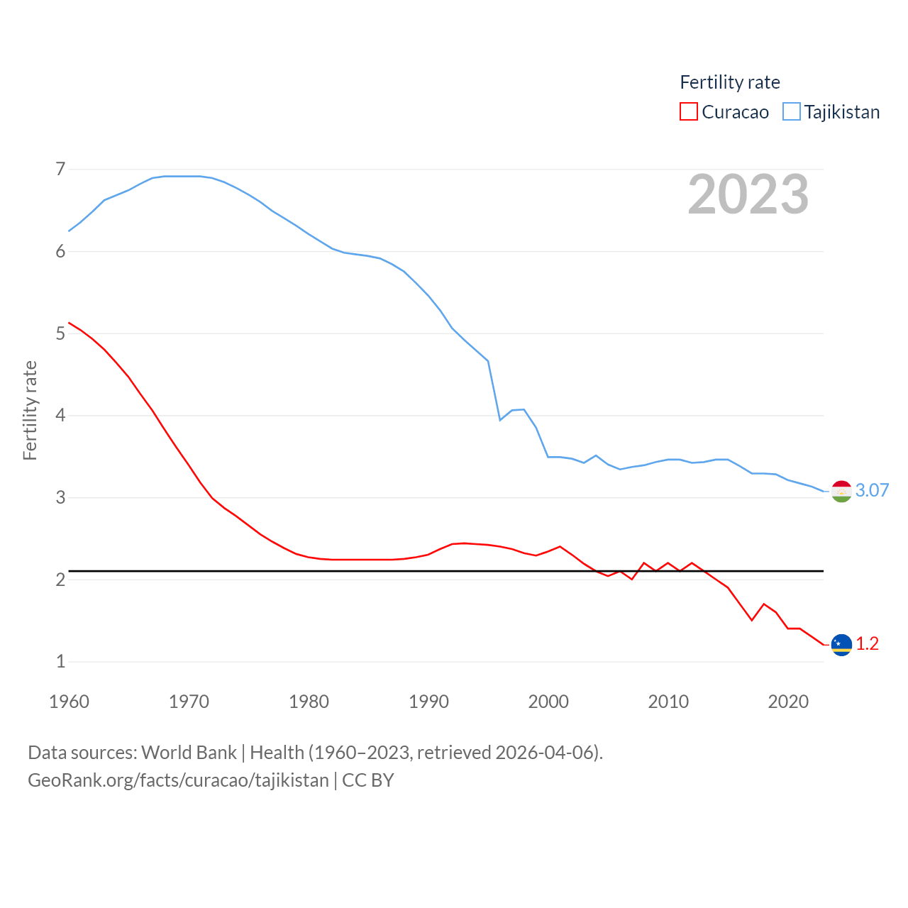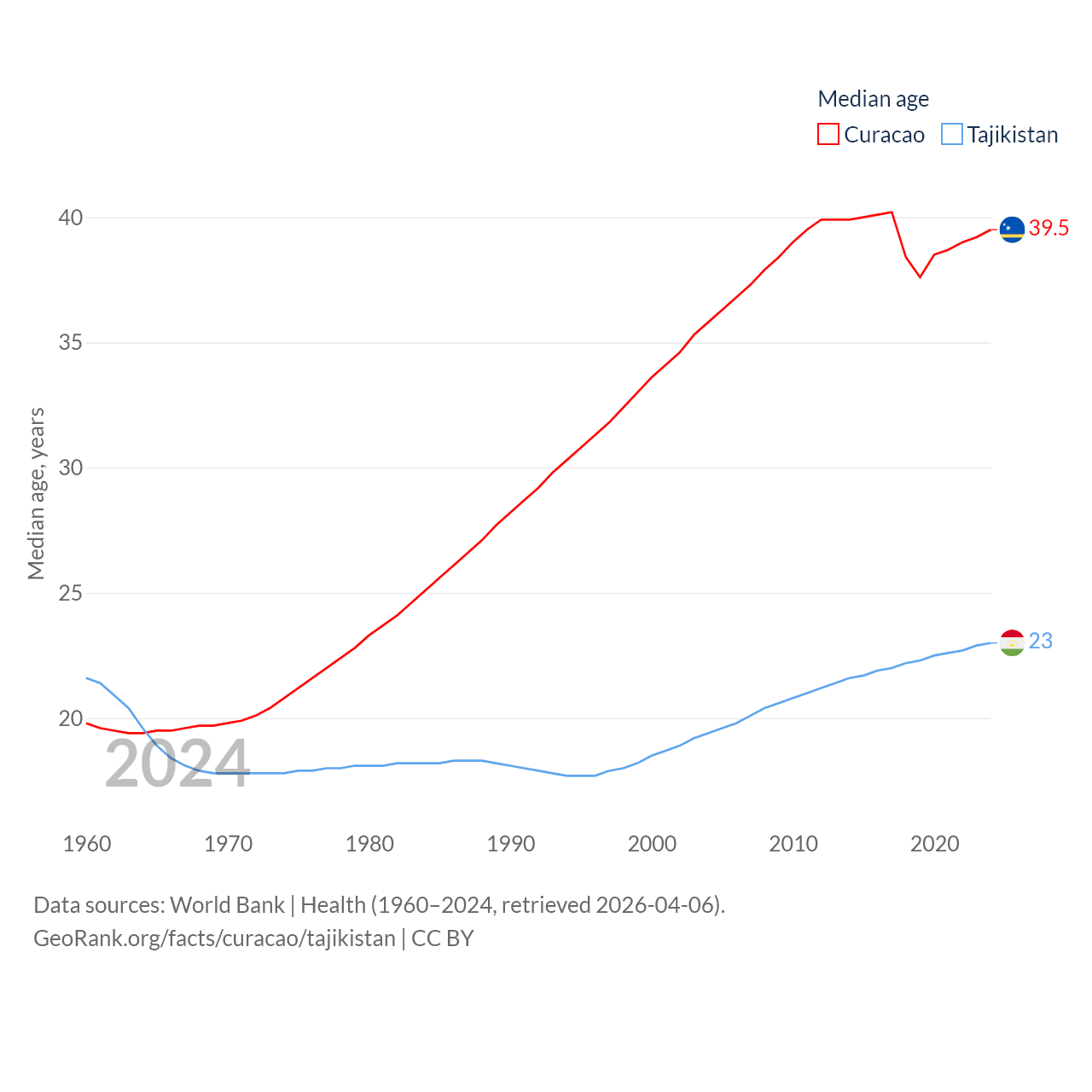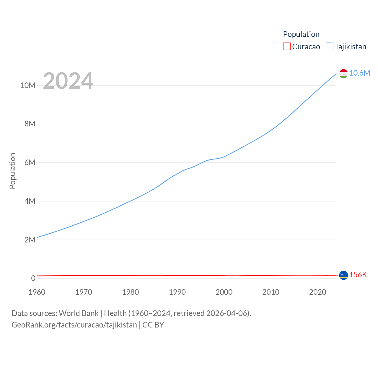Curacao has a population of 156K (ranked 179/197), compared with 10.6M in Tajikistan (ranked 91/197). Curacao's land area is 171.4 sq mi versus 53,587 sq mi for Tajikistan (ranked 182nd vs. 93rd).