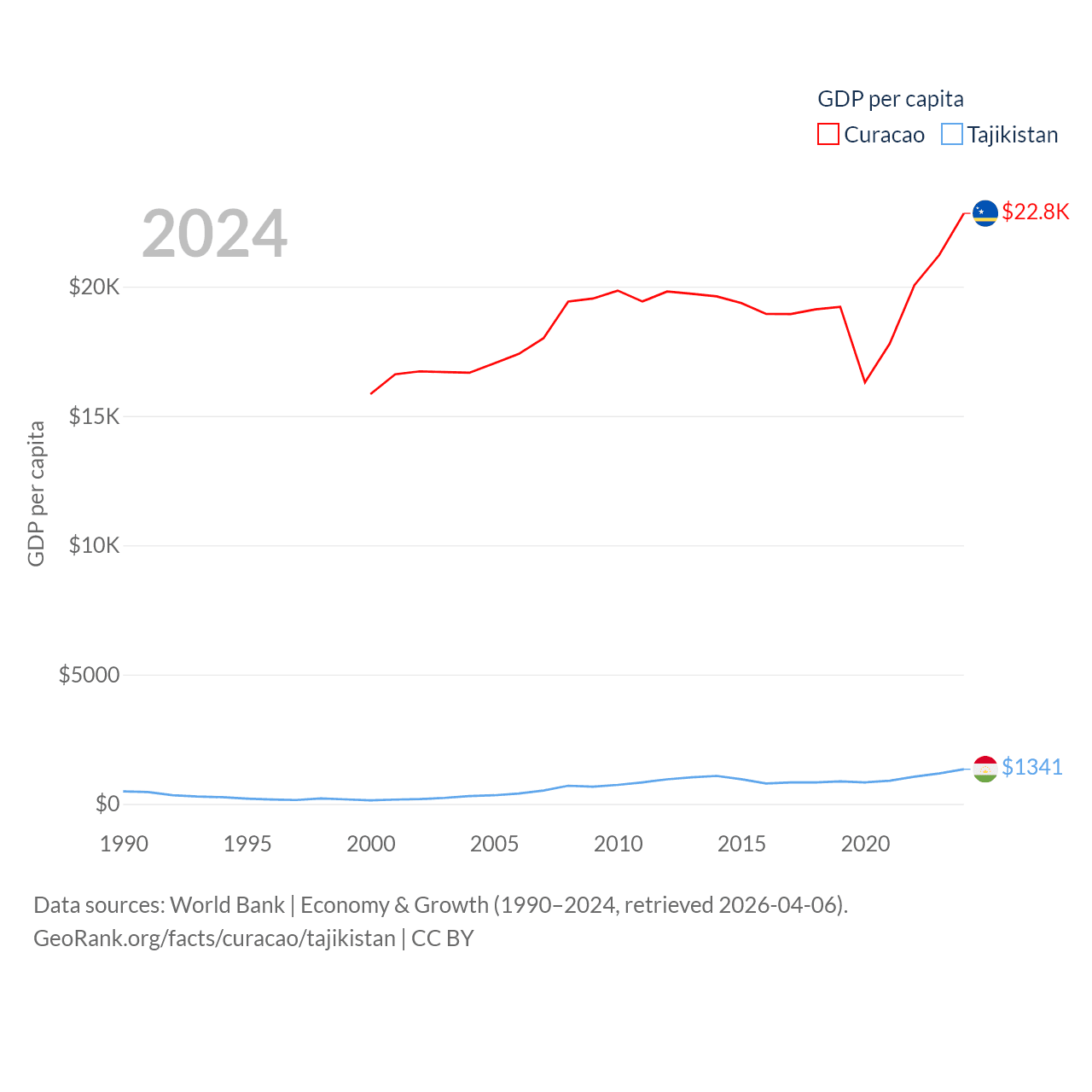 By GDP, Curacao ranks 167/197 ($3.56B) and Tajikistan ranks 145/197 ($14.2B). By GDP per capita, Curacao ranks 56/197 ($22,833), while Tajikistan ranks 166/197 ($1,341).