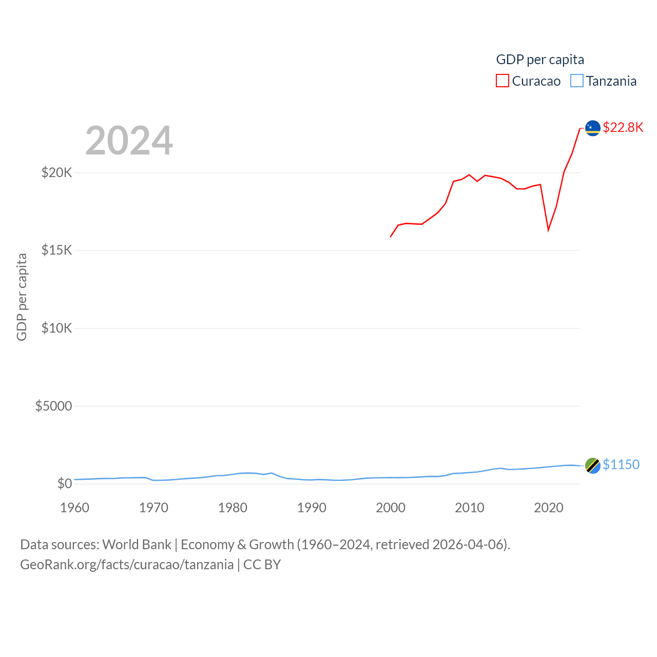 By GDP, Curacao ranks 167/197 ($3.56B) and Tanzania ranks 82/197 ($78.8B). By GDP per capita, Curacao ranks 56/197 ($22,833), while Tanzania ranks 170/197 ($1,150).