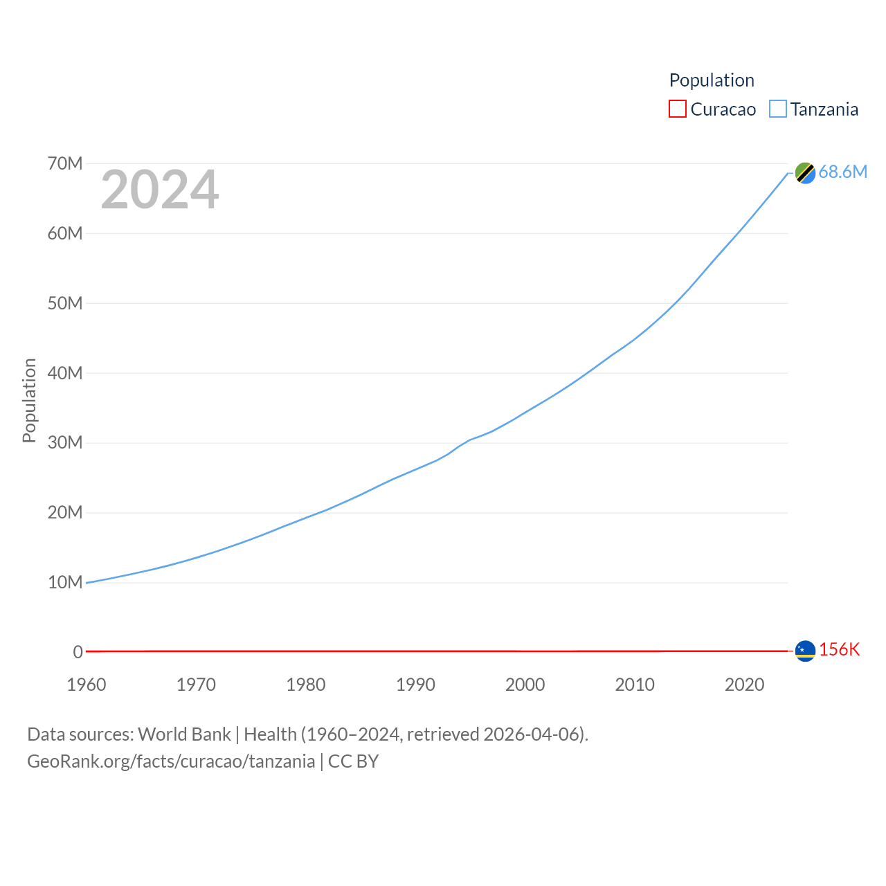 Curacao has a population of 156K (ranked 179/197), compared with 68.6M in Tanzania (ranked 22/197). Curacao's land area is 171.4 sq mi versus 342,009 sq mi for Tanzania (ranked 182nd vs. 31st).