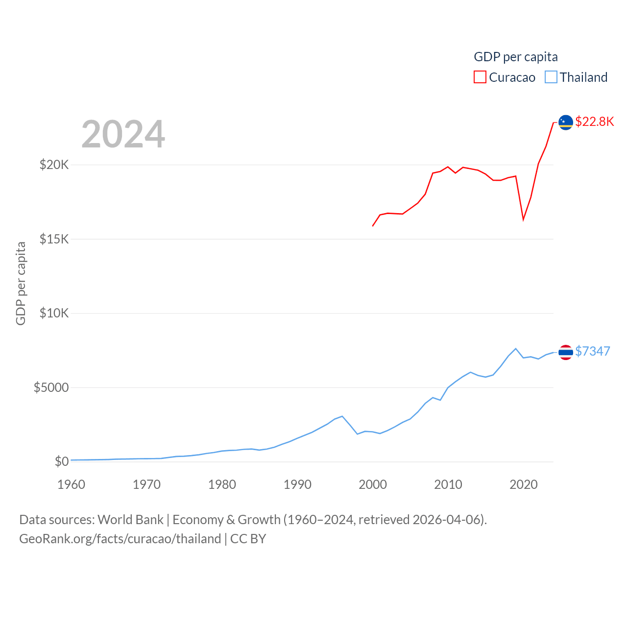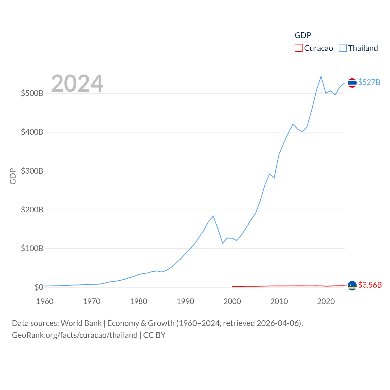 By GDP, Curacao ranks 167/197 ($3.56B) and Thailand ranks 31/197 ($527B). By GDP per capita, Curacao ranks 56/197 ($22,833), while Thailand ranks 100/197 ($7,347).