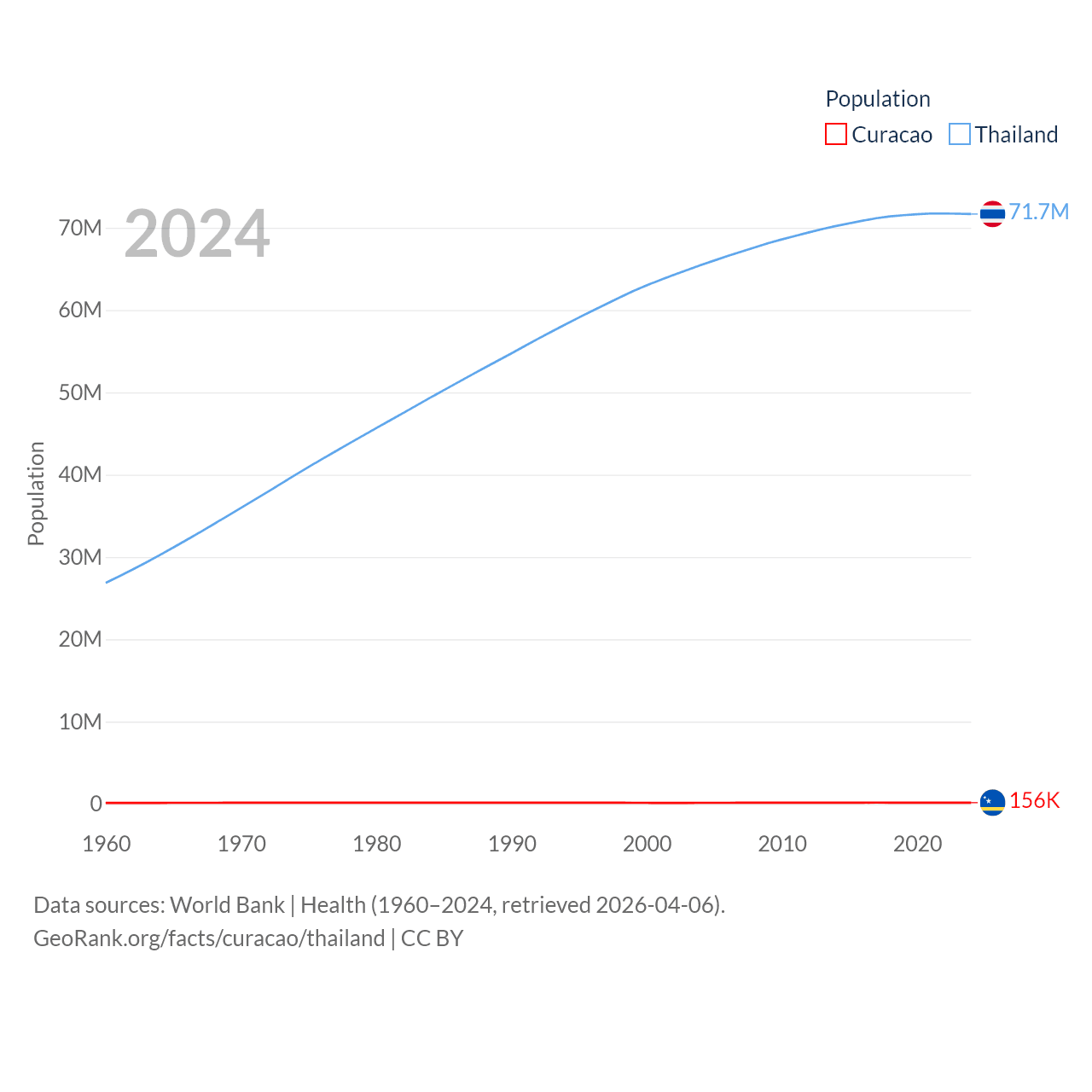 Curacao has a population of 156K (ranked 179/197), compared with 71.7M in Thailand (ranked 20/197). Curacao's land area is 171.4 sq mi versus 197,256 sq mi for Thailand (ranked 182nd vs. 50th).