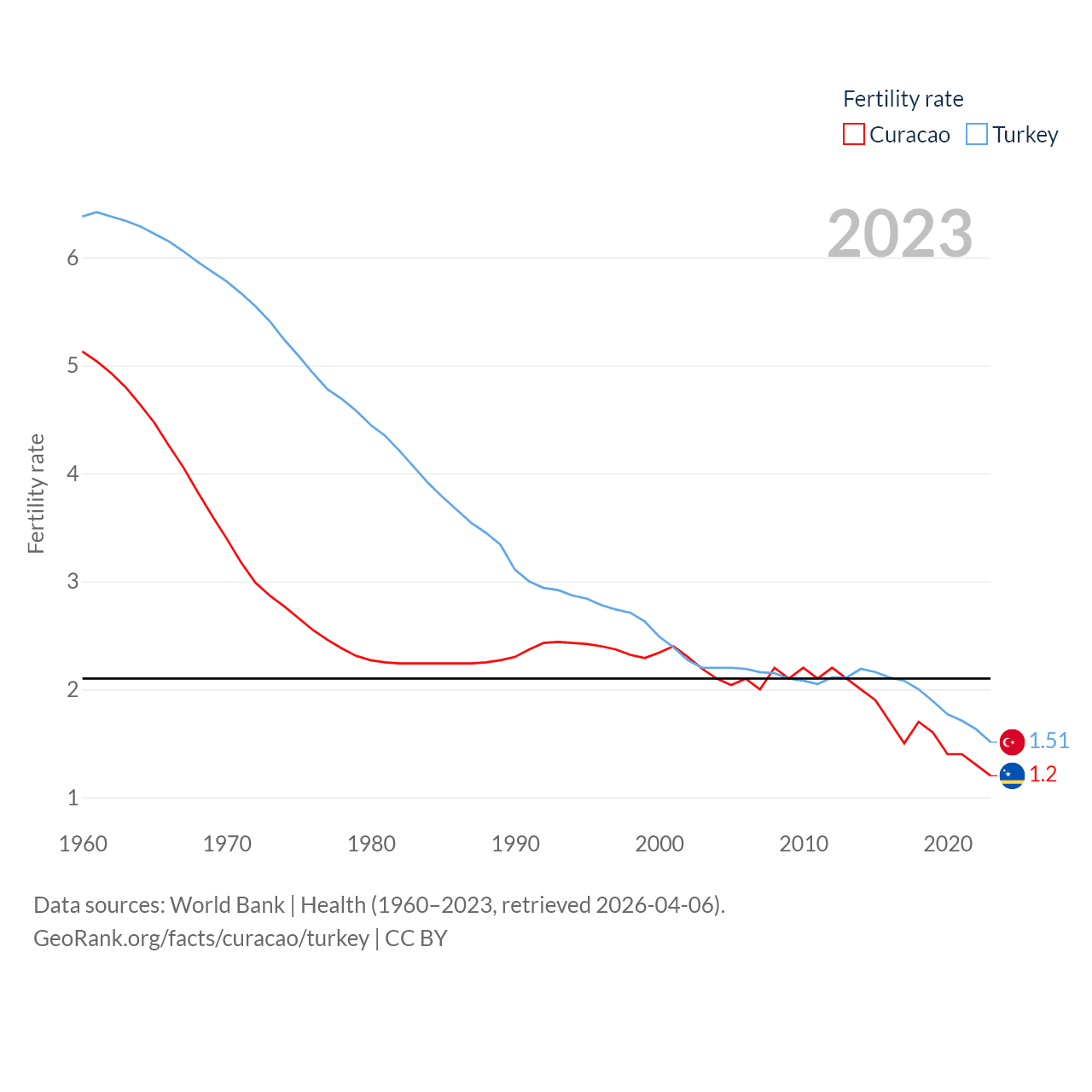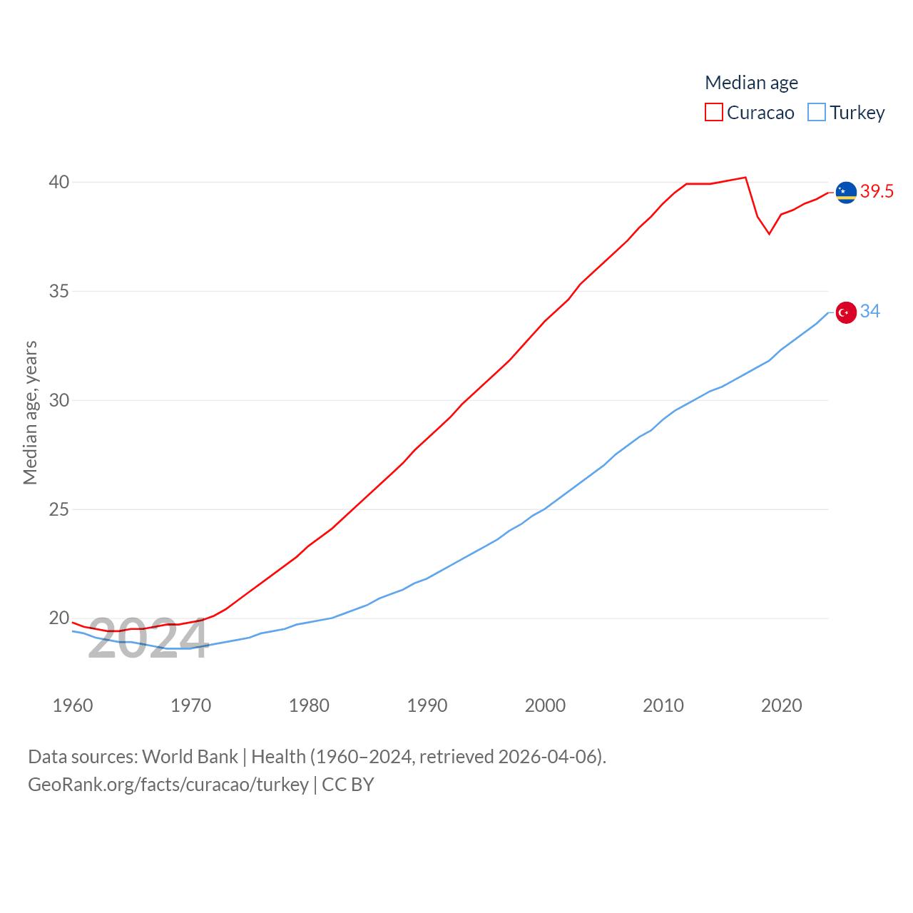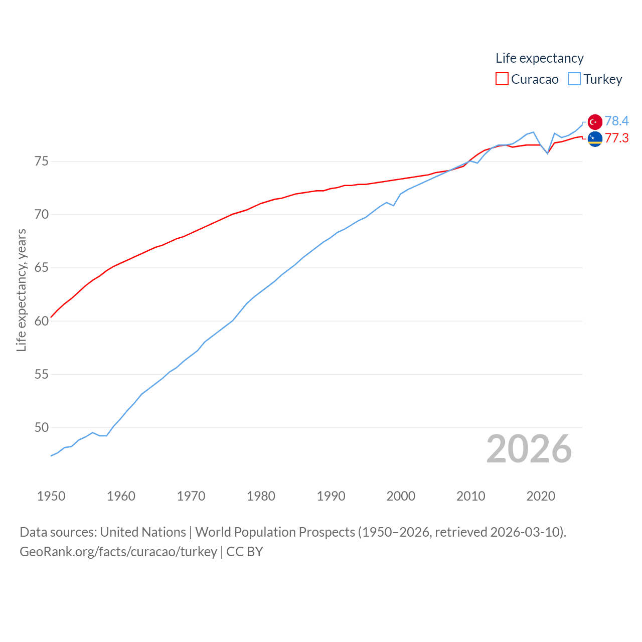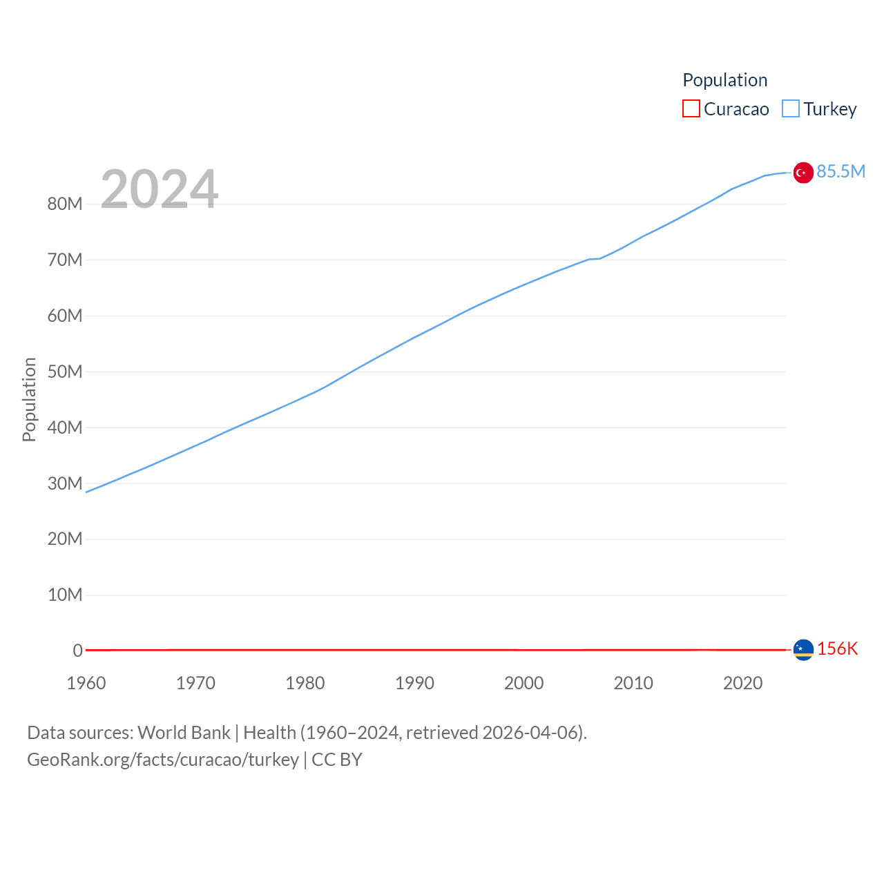 Curacao has a population of 156K (ranked 179/197), compared with 85.5M in Turkey (ranked 18/197). Curacao's land area is 171.4 sq mi versus 297,156 sq mi for Turkey (ranked 182nd vs. 36th).