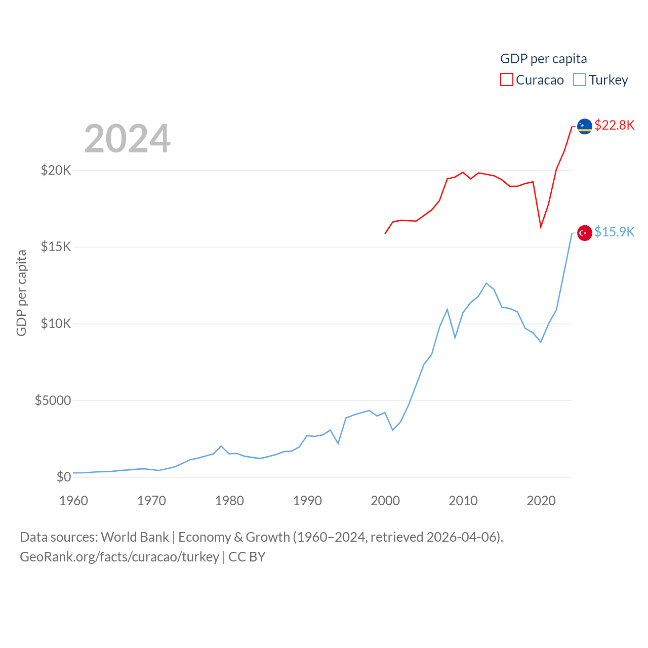 By GDP, Curacao ranks 167/197 ($3.56B) and Turkey ranks 17/197 ($1.36T). By GDP per capita, Curacao ranks 56/197 ($22,833), while Turkey ranks 66/197 ($15,893).