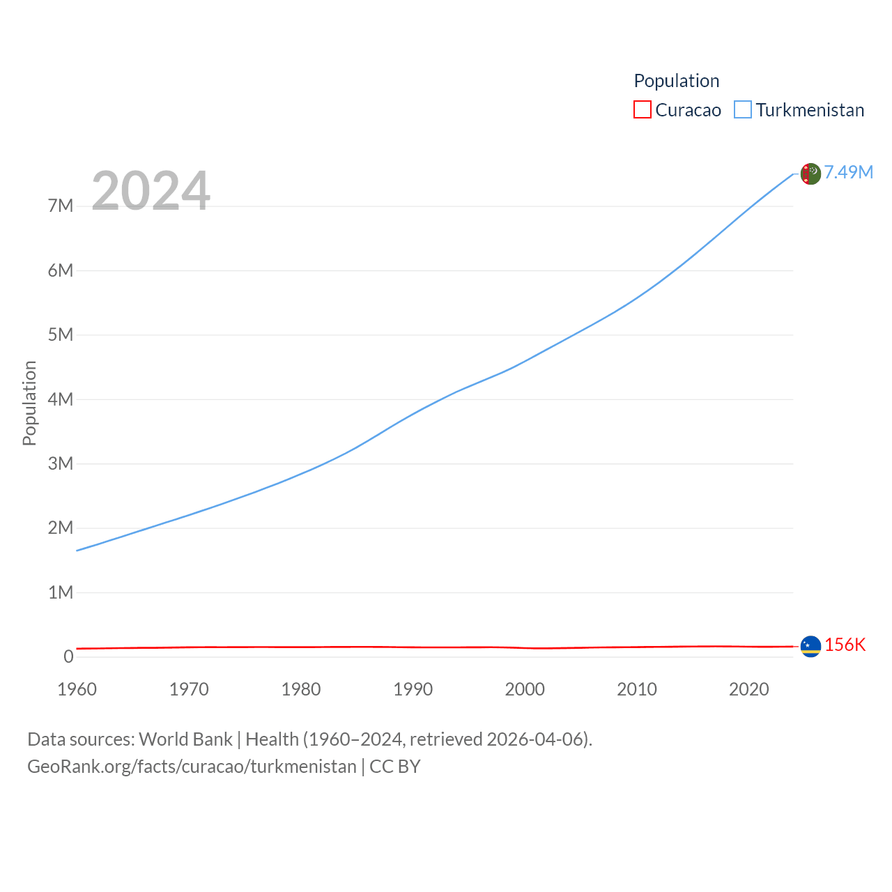 Curacao has a population of 156K (ranked 179/197), compared with 7.49M in Turkmenistan (ranked 104/197). Curacao's land area is 171.4 sq mi versus 181,441 sq mi for Turkmenistan (ranked 182nd vs. 53rd).
