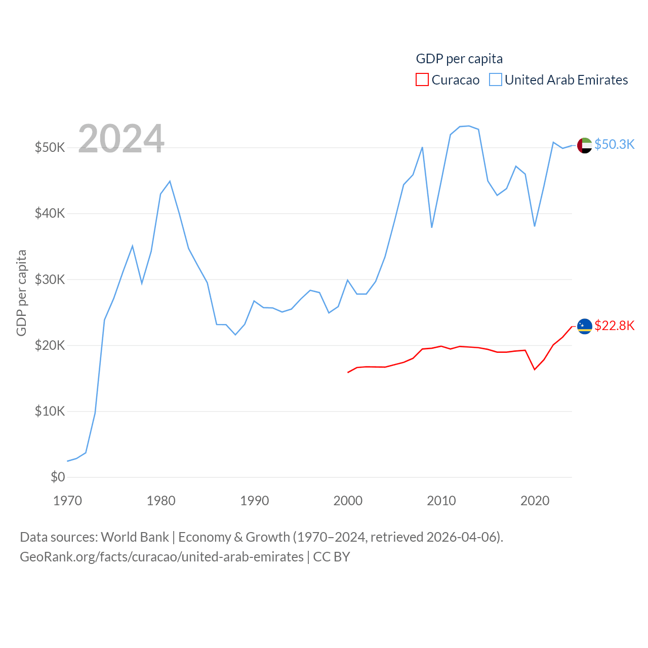By GDP, Curacao ranks 167/197 ($3.56B) and The United Arab Emirates ranks 27/197 ($552B). By GDP per capita, Curacao ranks 56/197 ($22,833), while The United Arab Emirates ranks 24/197 ($50,274).