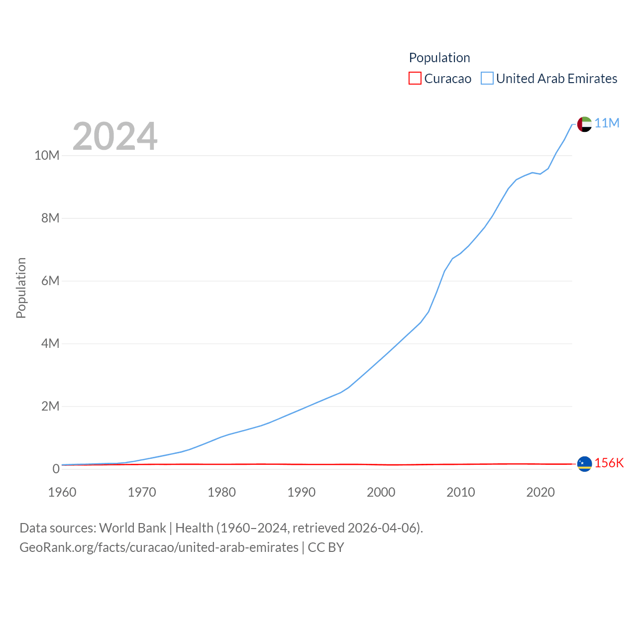 Curacao has a population of 156K (ranked 179/197), compared with 11M in The United Arab Emirates (ranked 86/197). Curacao's land area is 171.4 sq mi versus 27,421 sq mi for The United Arab Emirates (ranked 182nd vs. 117th).