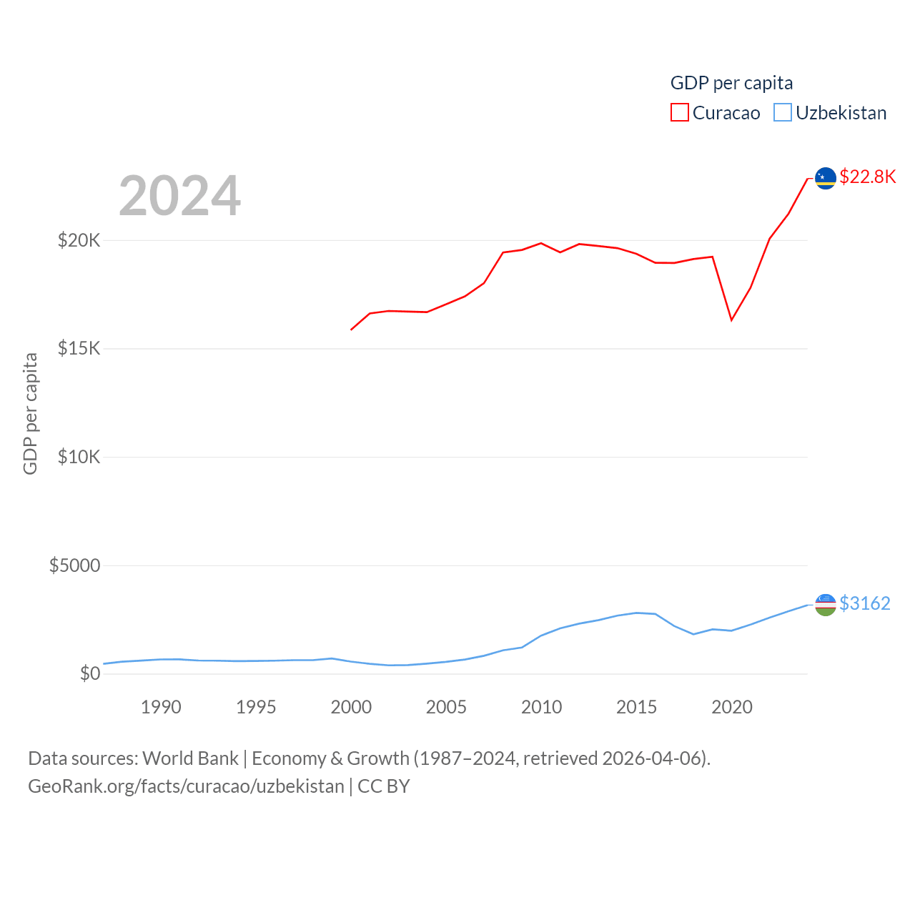 By GDP, Curacao ranks 167/197 ($3.56B) and Uzbekistan ranks 66/197 ($115B). By GDP per capita, Curacao ranks 56/197 ($22,833), while Uzbekistan ranks 139/197 ($3,162).