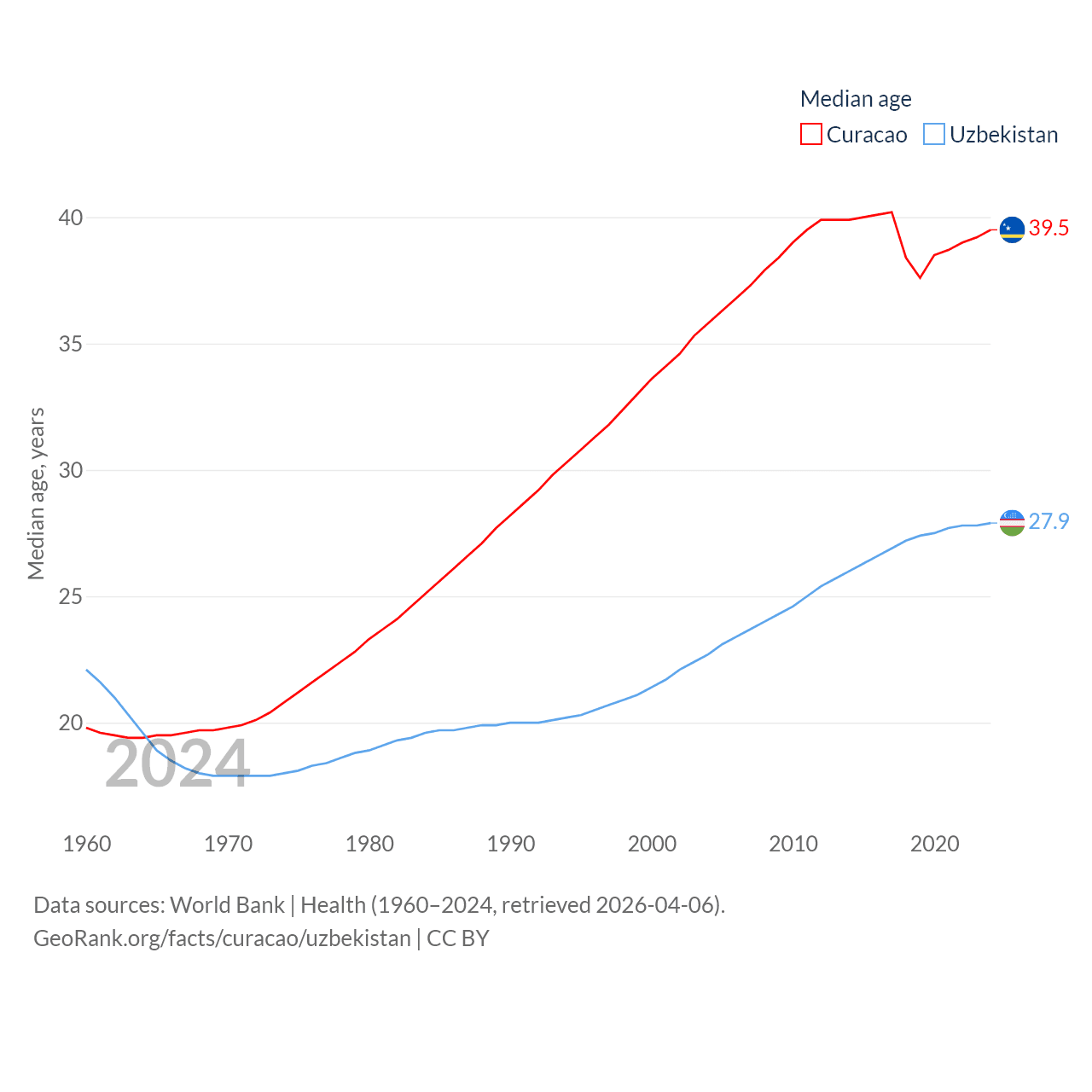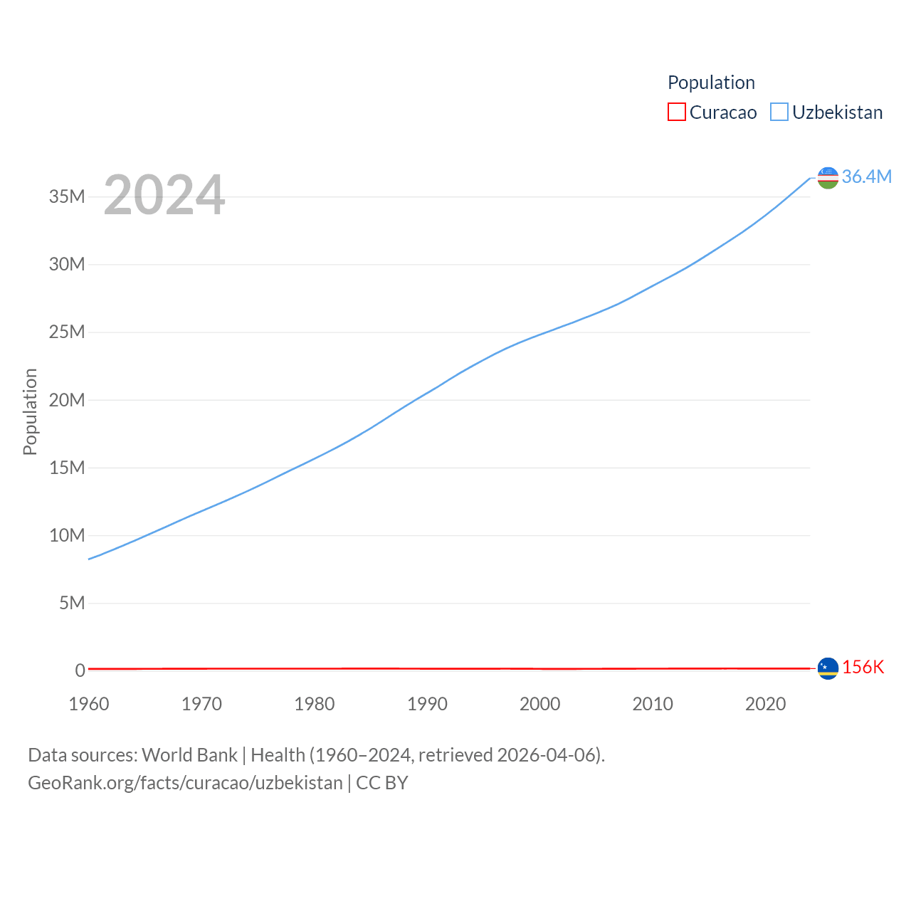 Curacao has a population of 156K (ranked 179/197), compared with 36.4M in Uzbekistan (ranked 43/197). Curacao's land area is 171.4 sq mi versus 170,136 sq mi for Uzbekistan (ranked 182nd vs. 56th).
