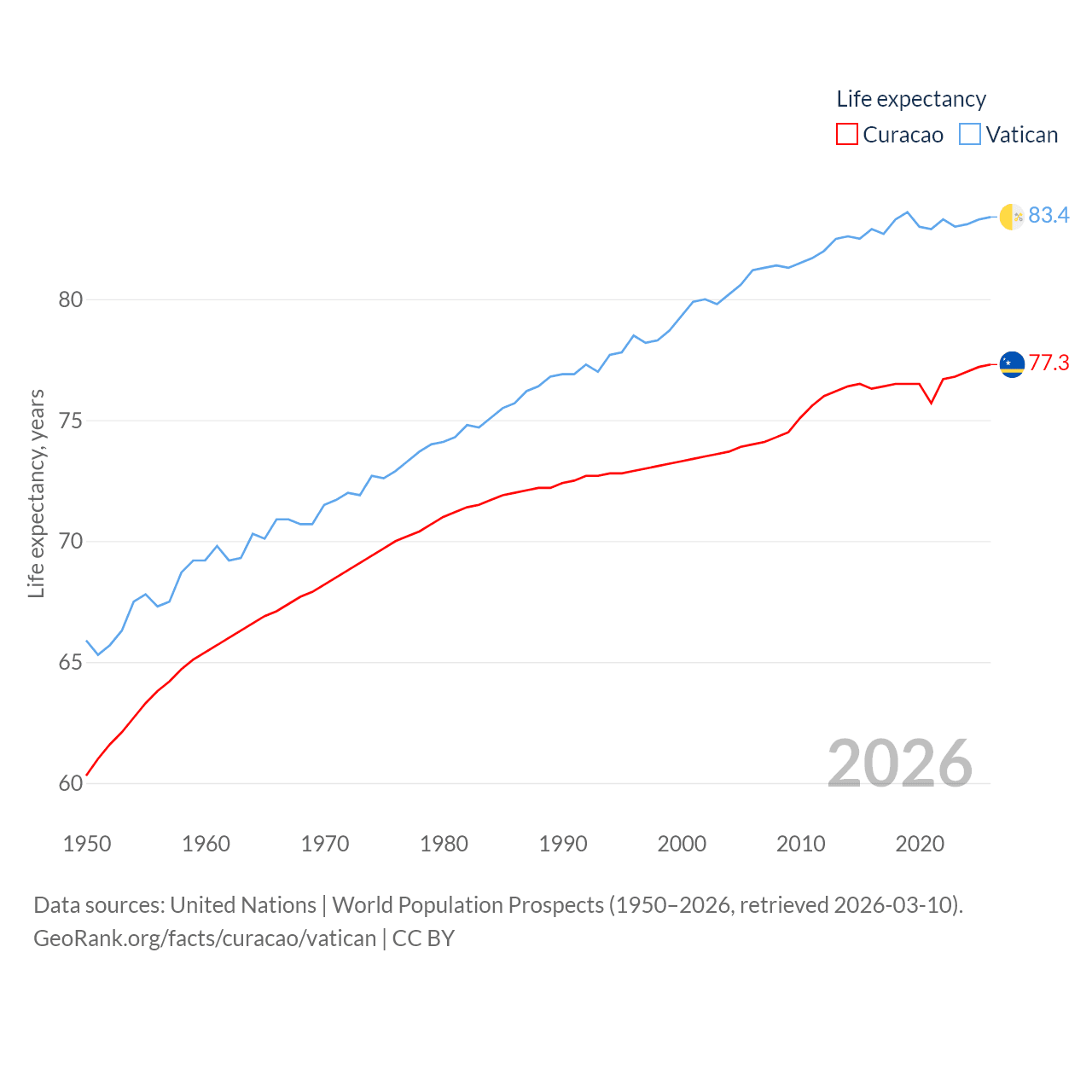 Use the buttons below to switch between world maps comparing statistics for Curacao and the Vatican.